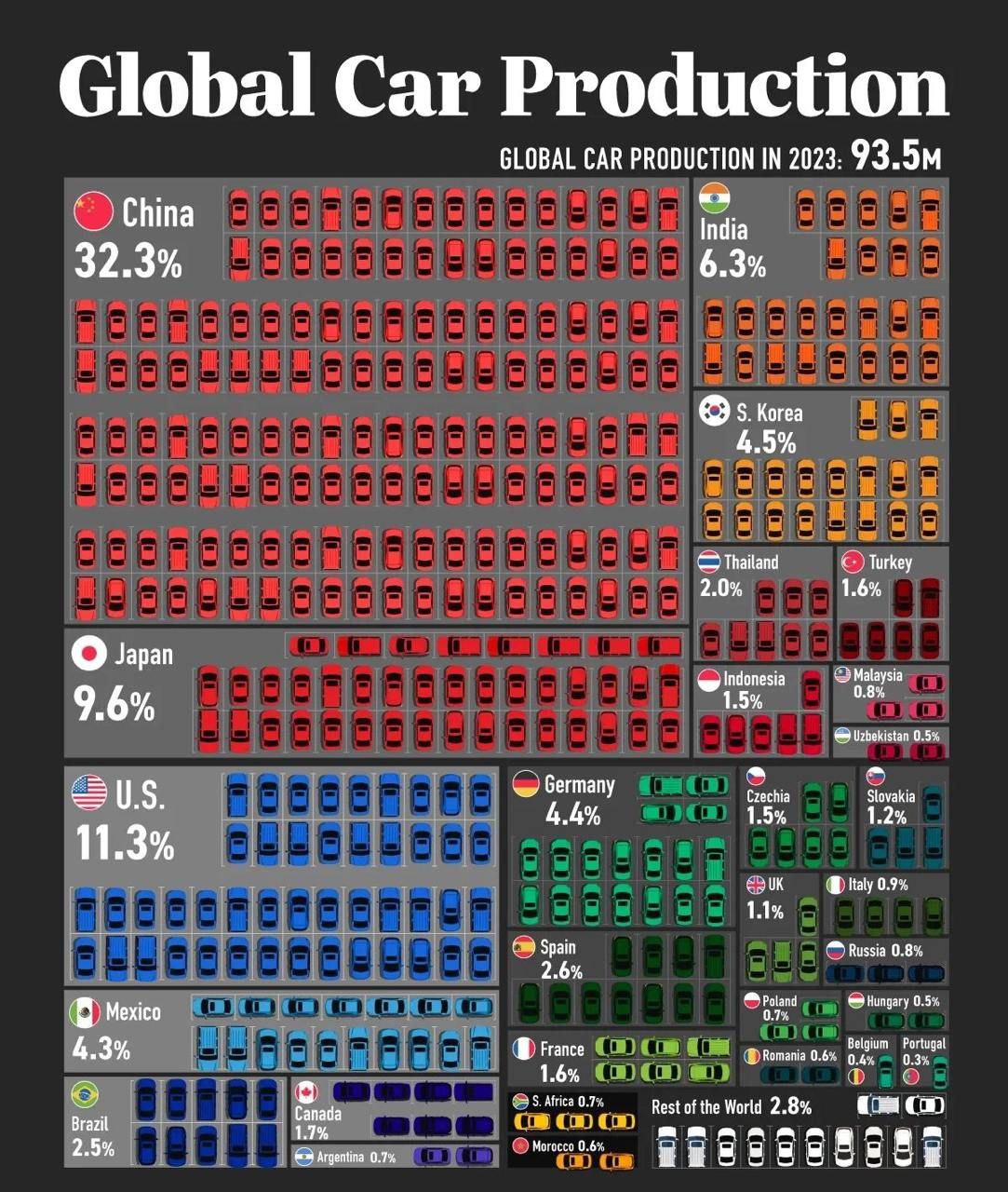 Китай обеспечивает треть производства автомобилей в мире, тогда как США производят лишь 11,3%, а Россия — менее 1%.
