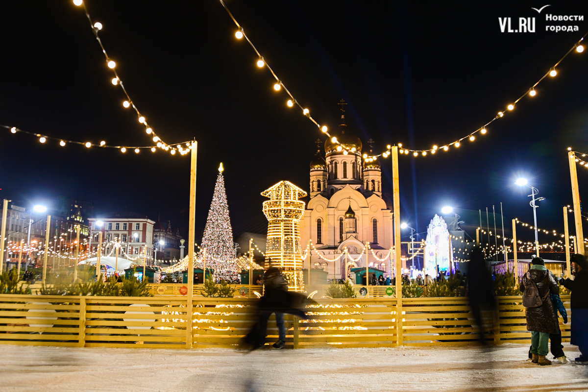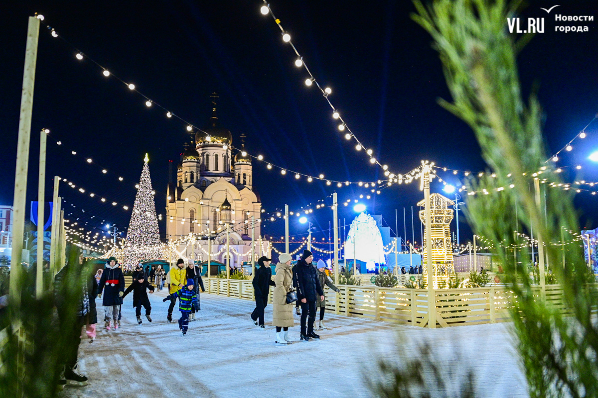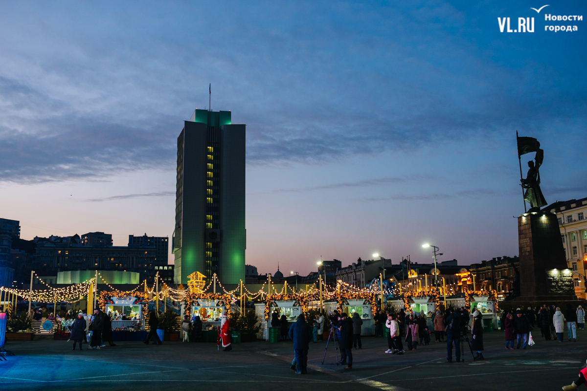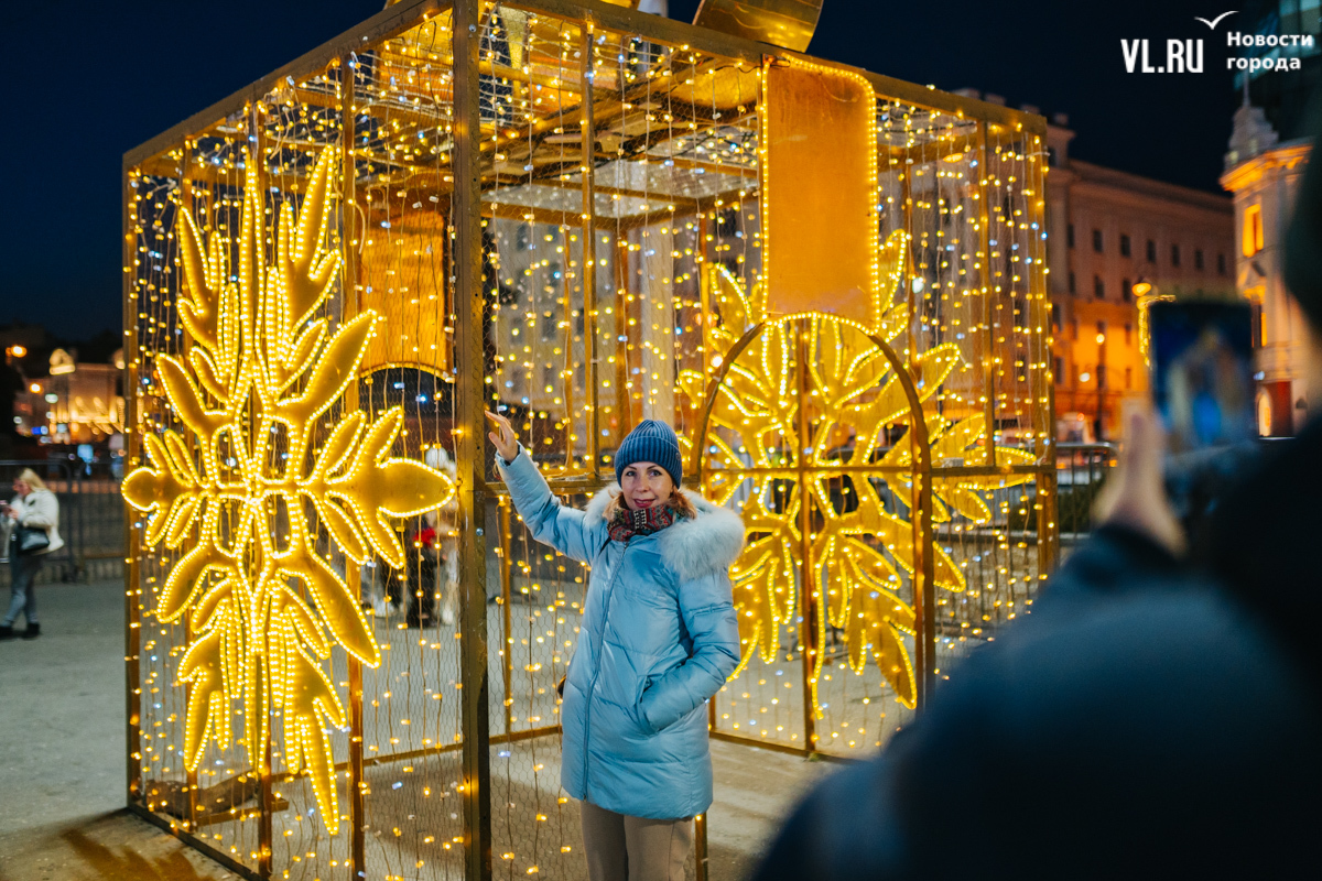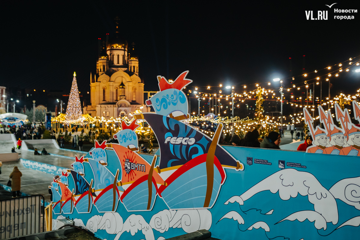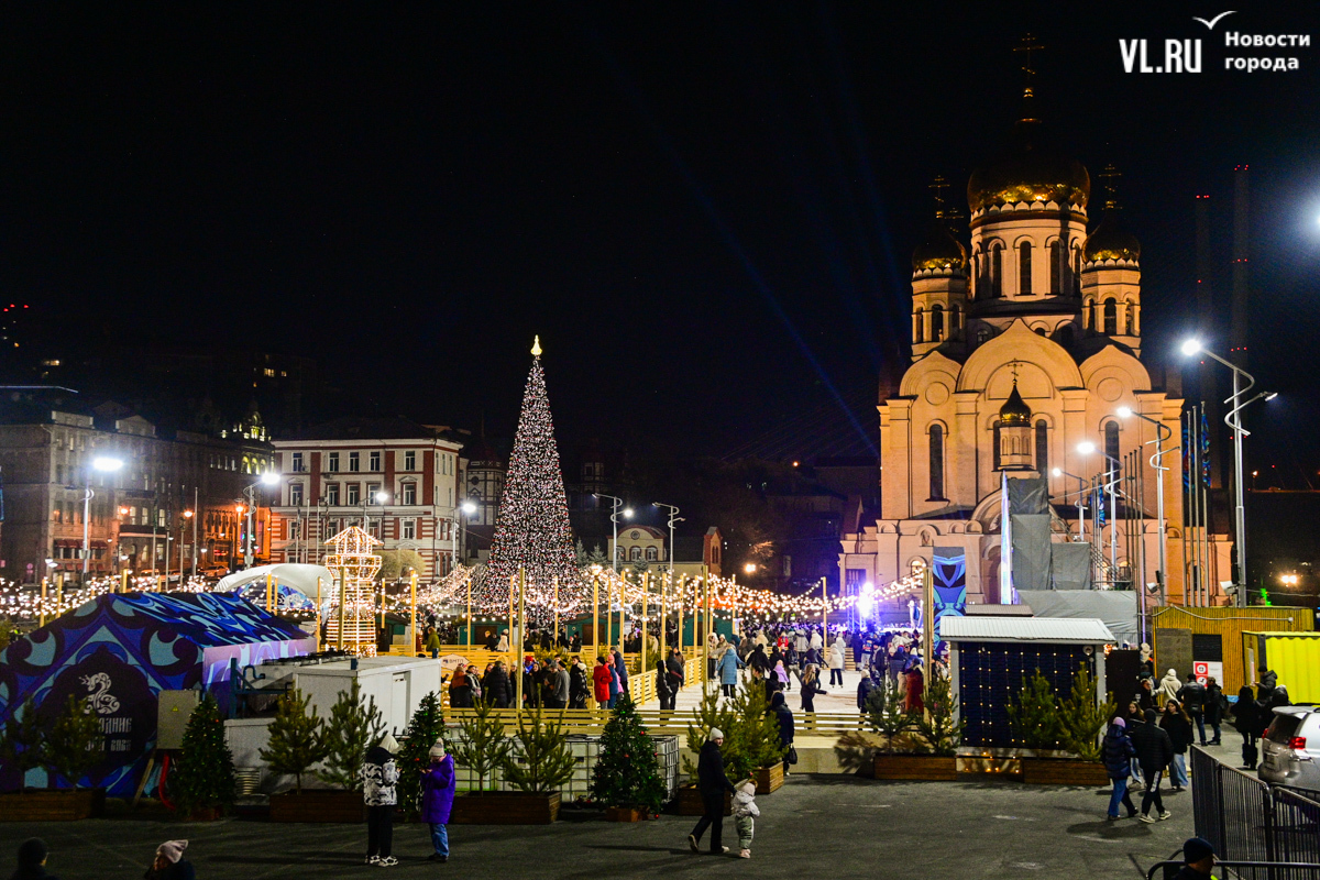 Меньше чем за неделю до Нового года, посреди рабочей недели, на центральной площади Владивостока открылся новогодний городок с катком и горками и прошёл концерт для горожан. Получился небольшой праздник, который скрасила необычно тёплая погода. Зажглись огни на ёлке, по площади ходили аниматоры, со сцены артисты пели новогодние песни. В финале праздничного открытия выступила группа «Интонация».