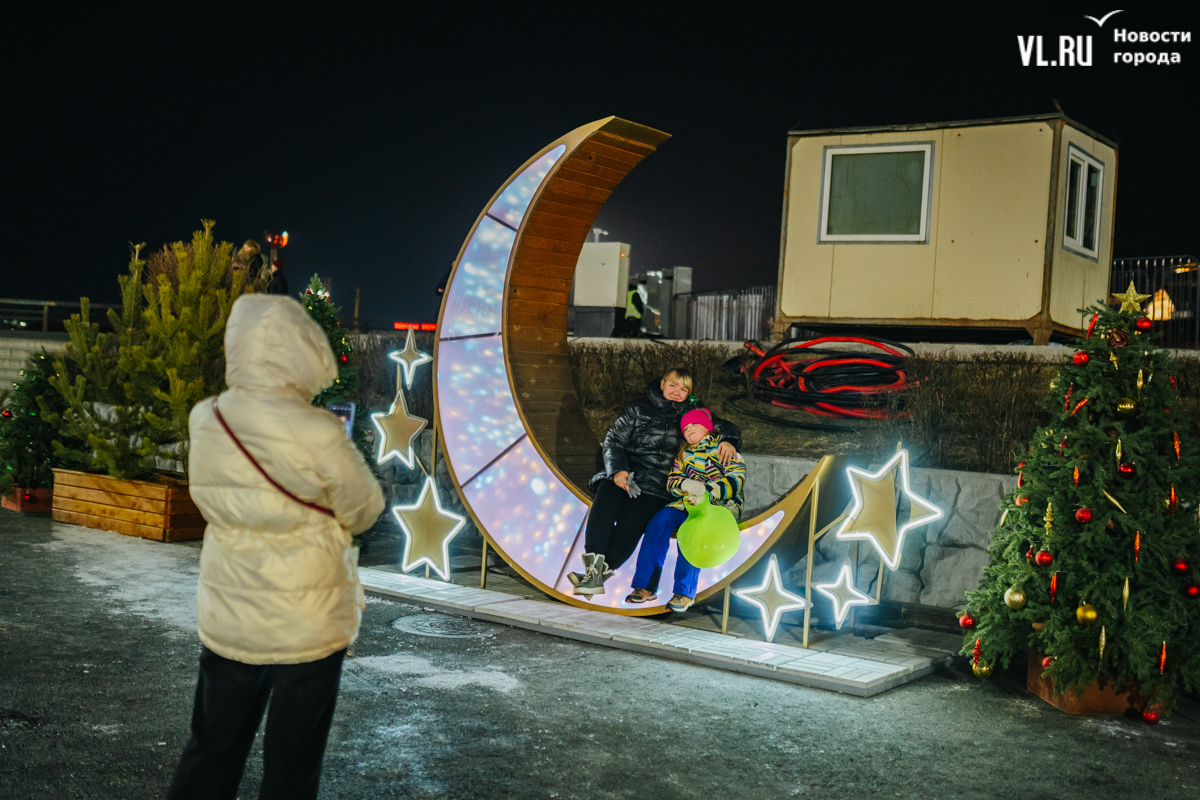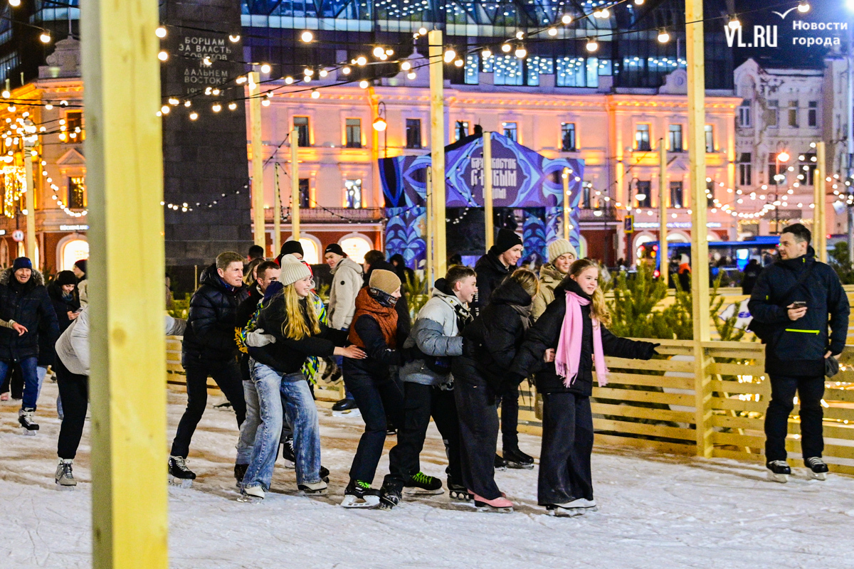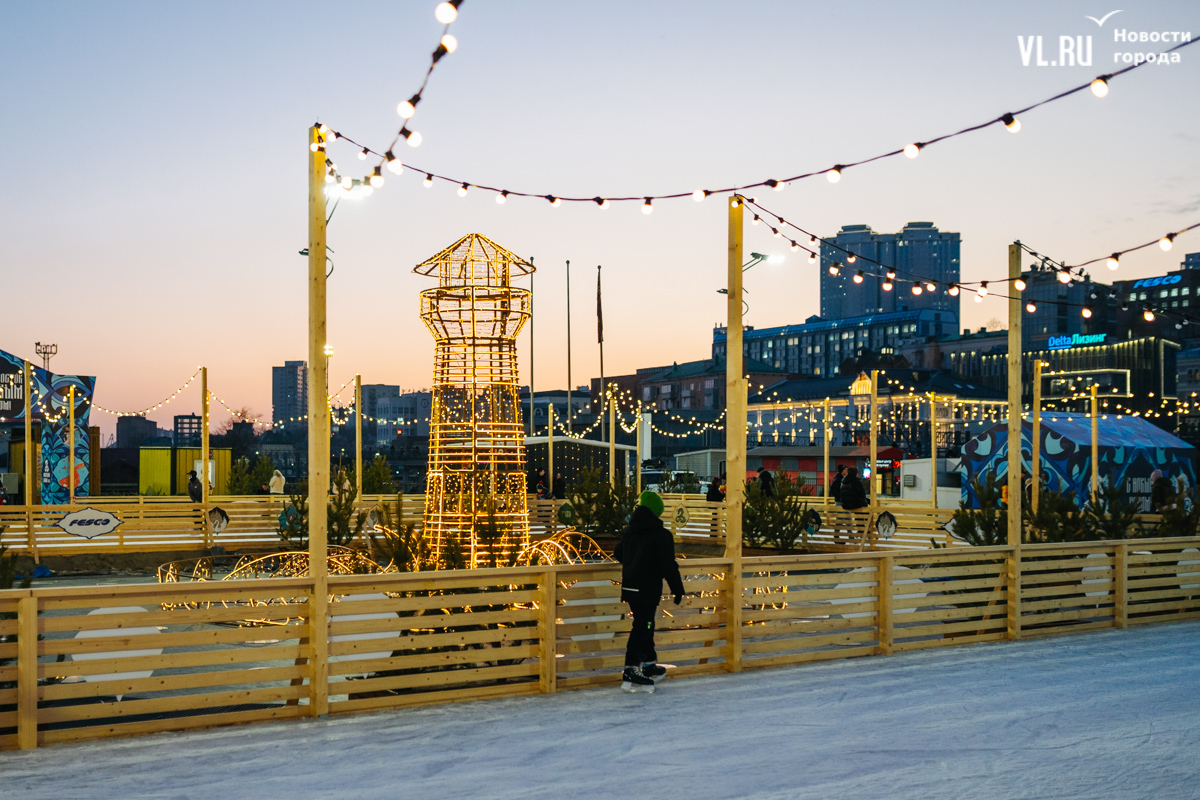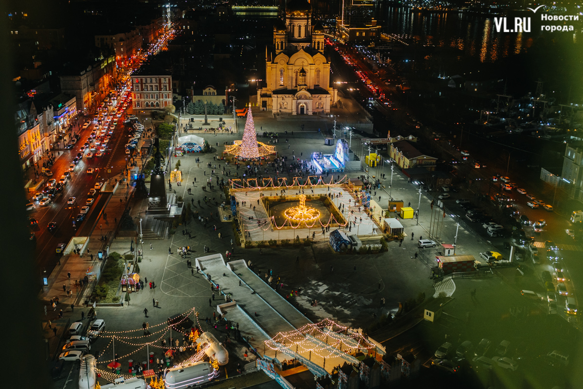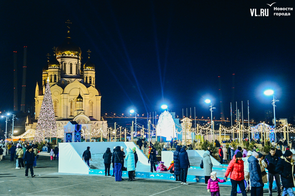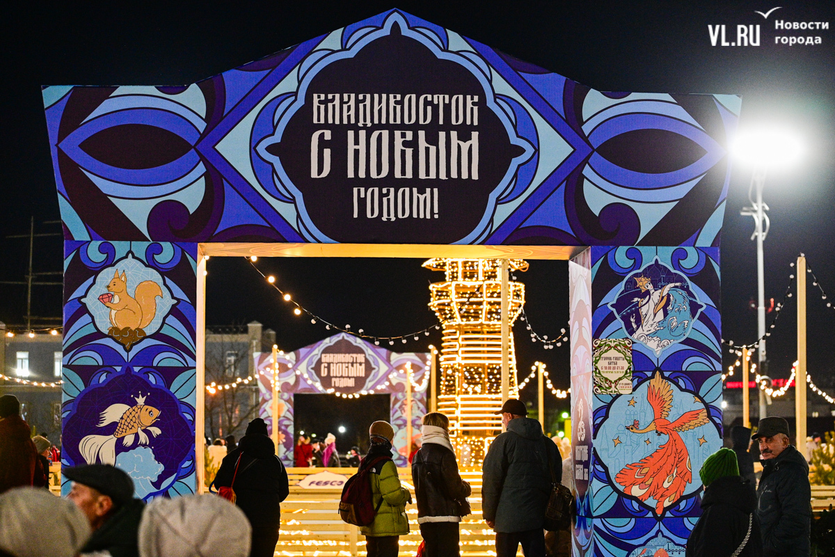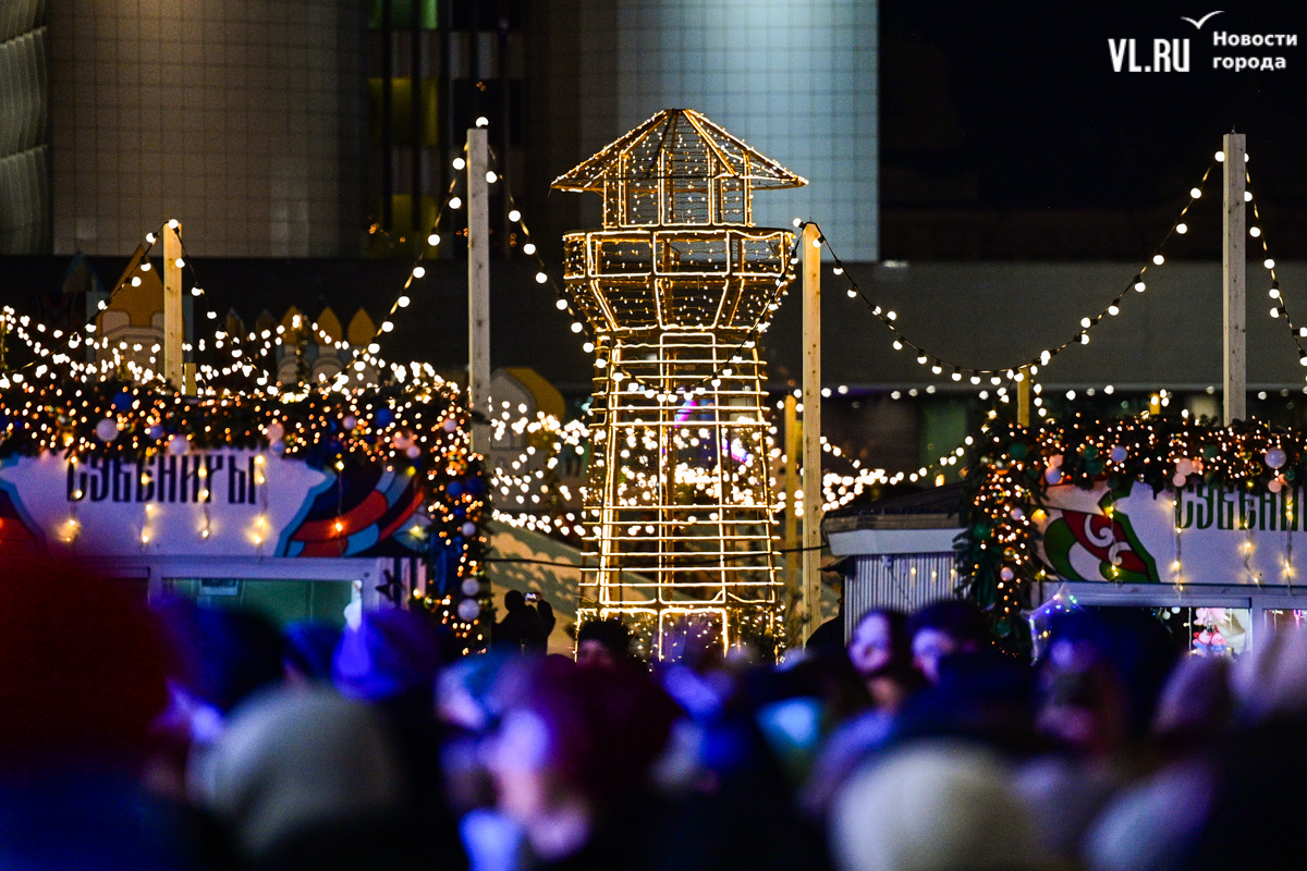Меньше чем за неделю до Нового года, посреди рабочей недели, на центральной площади Владивостока открылся новогодний городок с катком и горками и прошёл концерт для горожан. Получился небольшой праздник, который скрасила необычно тёплая погода. Зажглись огни на ёлке, по площади ходили аниматоры, со сцены артисты пели новогодние песни. В финале праздничного открытия выступила группа «Интонация».