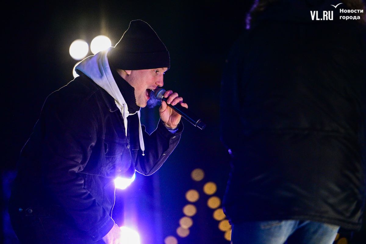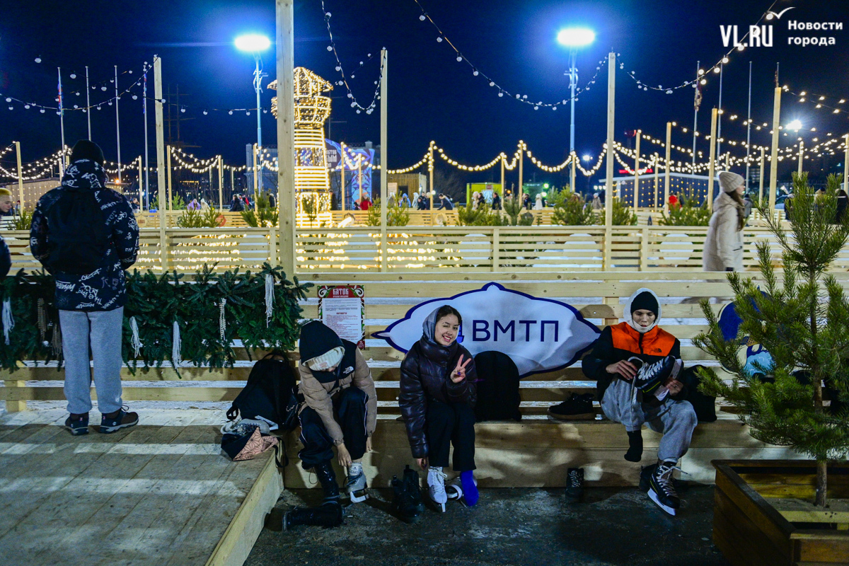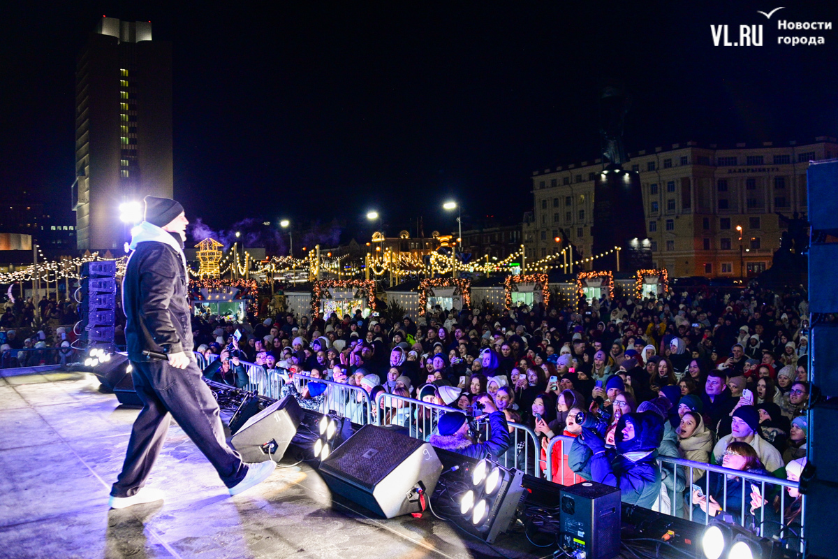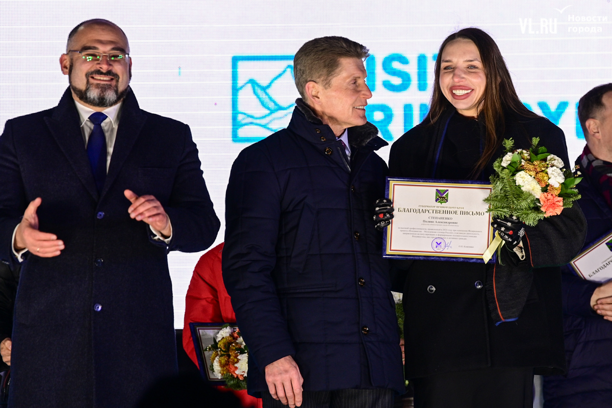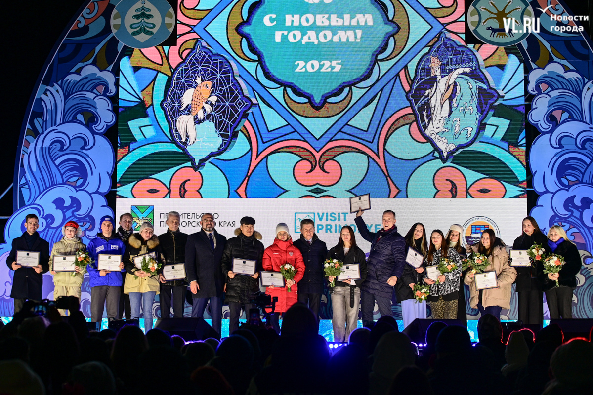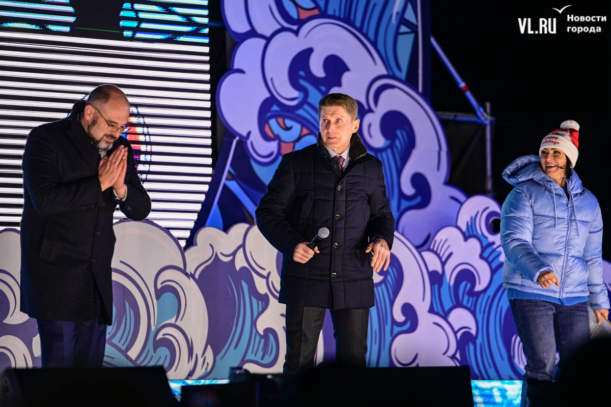 К 19 часам молодых зрителей стало больше. Губернатор края и мэр Владивостока поздравили жителей с наступающими праздниками, пригласили проводить выходные на площади и обязательно прийти на открытие бесплатного катка на стадионе «Авангард», а также наградили молодых людей за активность в проектах Молодёжной столицы.