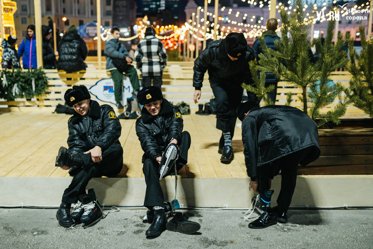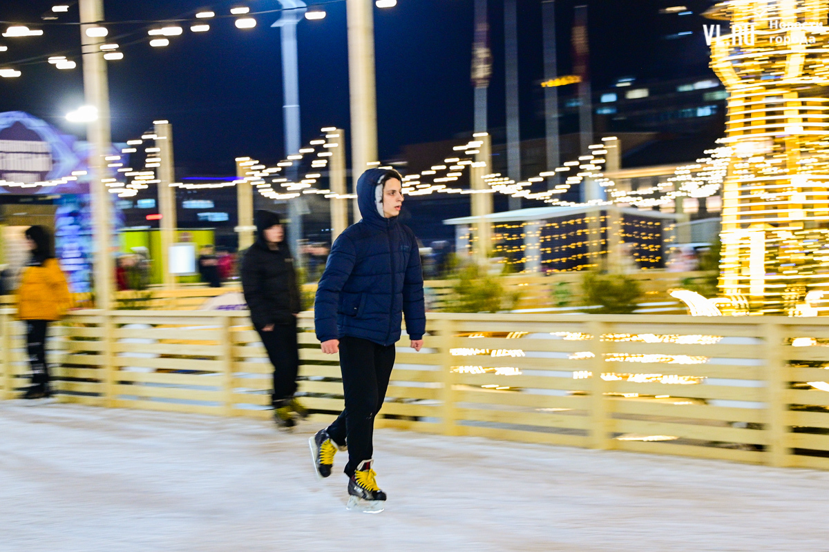 Каток обещали открыть вечером, но ещё днём на него пустили посетителей. А к открытию городка он был уже полон любителями покататься. Не удивительно, ведь назначенное на этот же день открытие катков на «Авангарде» и в парке Лазо перенесли из-за тёплой погоды. Видимо, все, кто уже наточил коньки, поехали сюда. Переобувались они перед катком на лавочках, вещи оставляли там же или заносили внутрь. Дети, подростки и взрослые в коньках гоняли по кругу и иногда останавливались у забора, чтобы посмотреть на светящийся гирляндами маяк на внутренней площадке. Для этого же иногда на каток заходили и в обычной обуви, но пройти через мчащихся конькобежцев было задачей не из лёгких. Лёд быстро покрылся снежным песком, но это не мешало кататься горожанам.