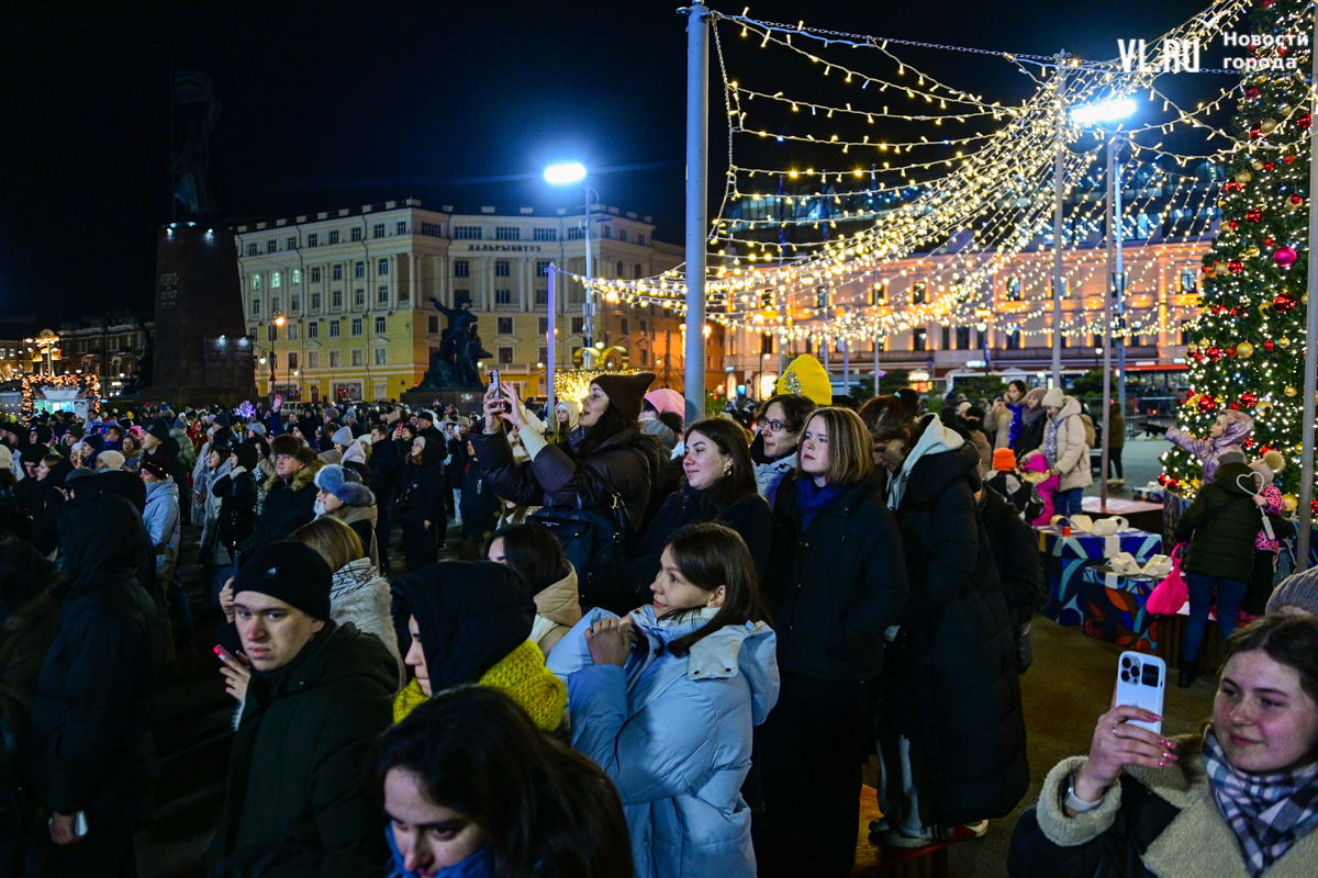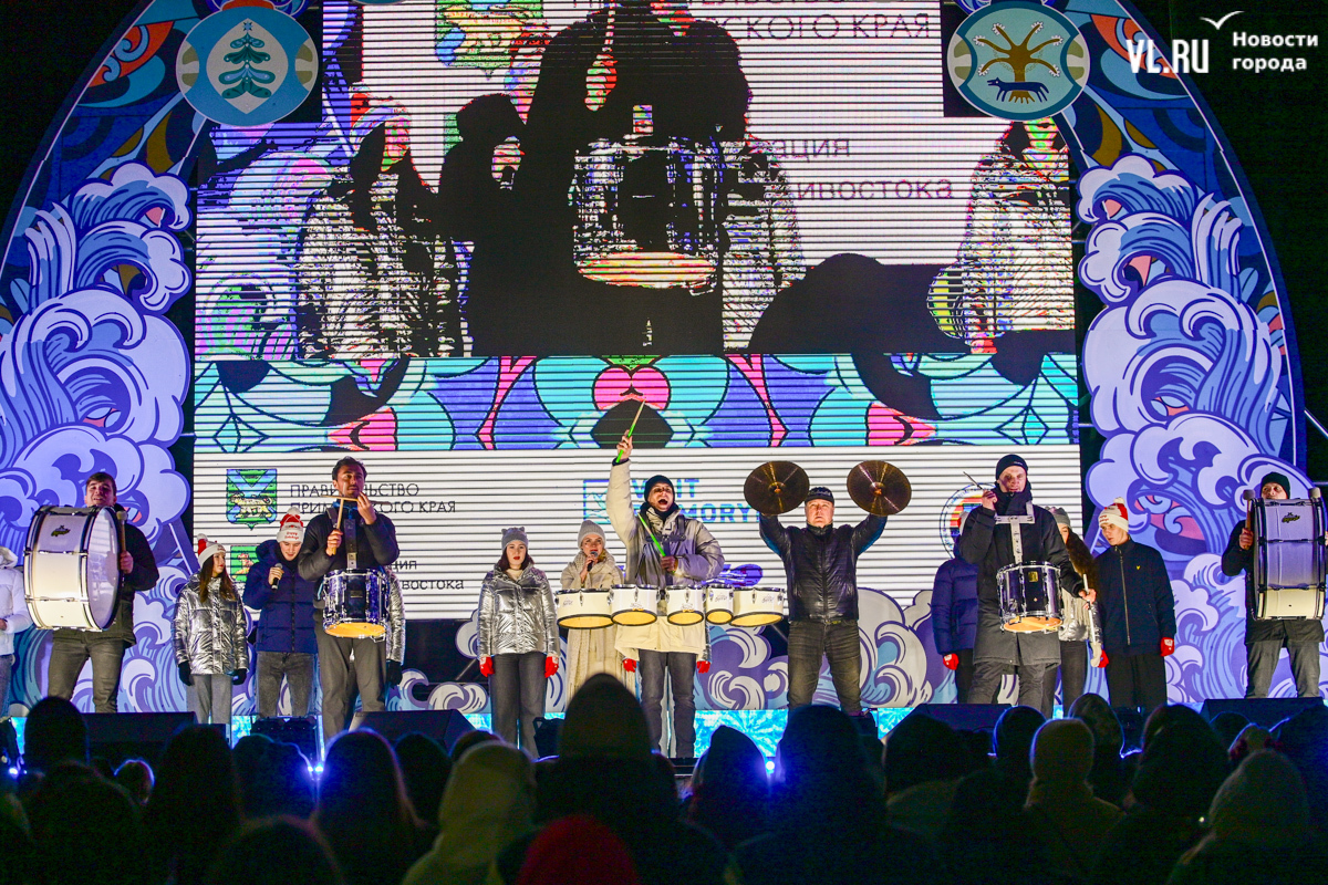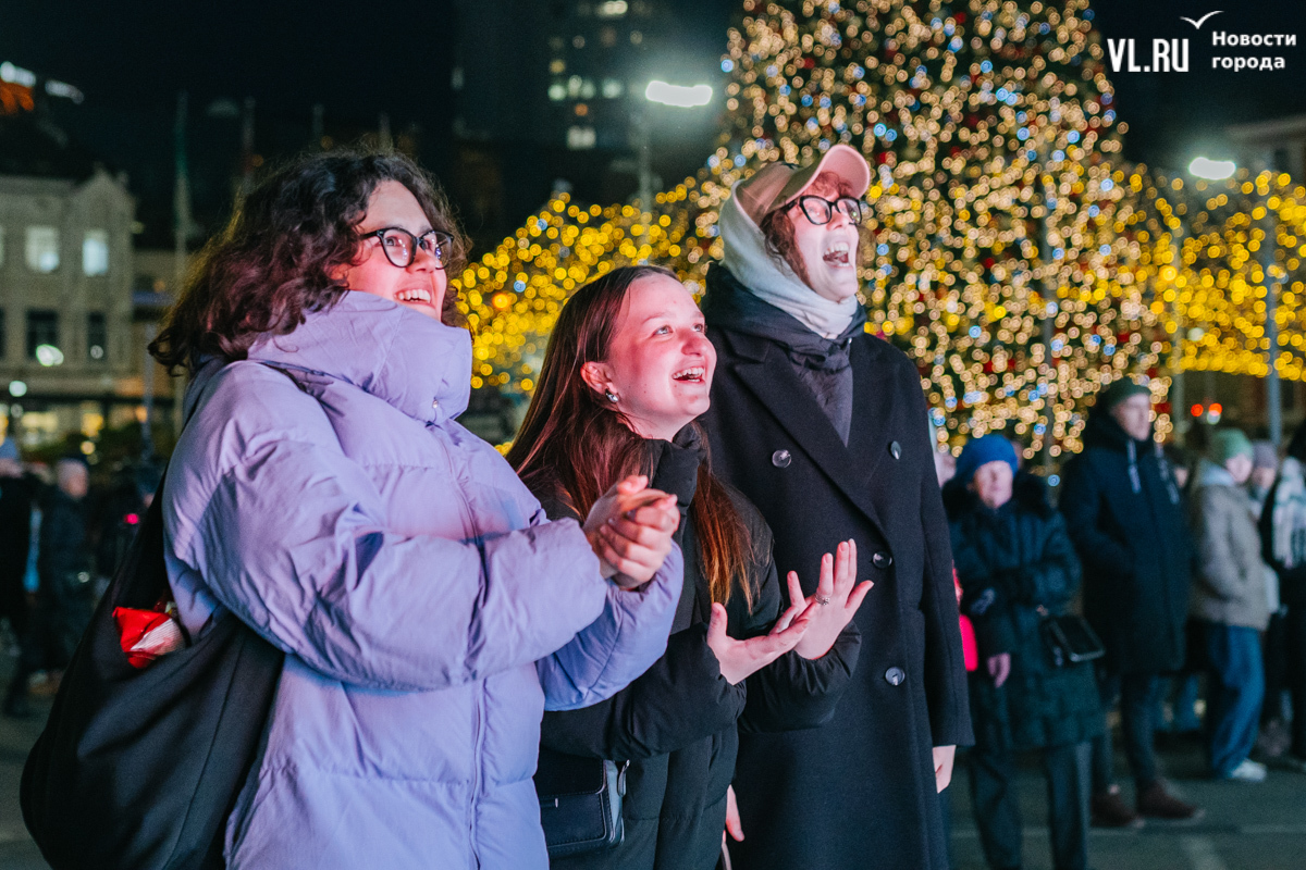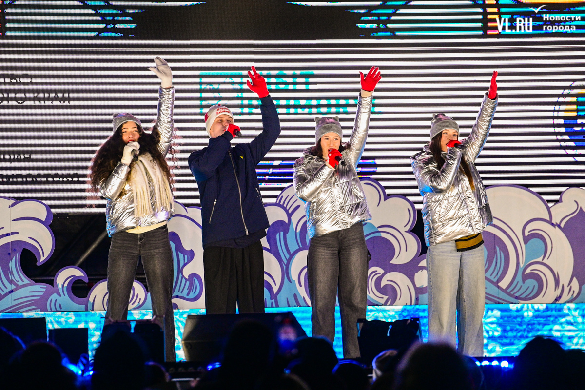 А на сцене с 18:00 ведущие изо всех сил поднимали настроение горожанам – спрашивали их о самых ярких событиях года, предлагали угадать песню и рассказать рецепт оливье. И ещё хвалили молодёжь и восторгались ею, что в Молодёжной столице за 2024-й стало уже нормой. Коллективы Владивостока помогали людям не замёрзнуть и вызывали вьюгу новогодними песнями про ледяной потолок и кружащийся снег. Радости зрителям добавляли аниматоры в блестящих костюмах ёлочных шаров, оленей, лошадей и пиратов.