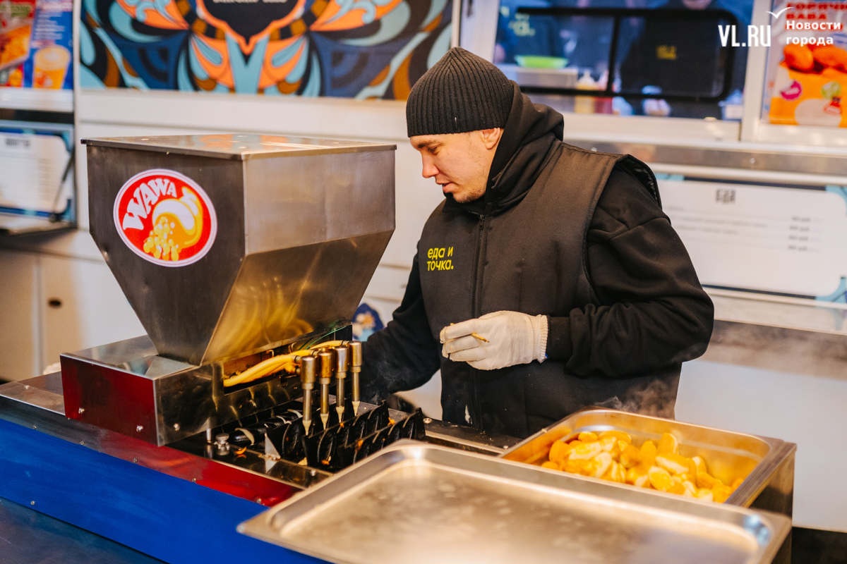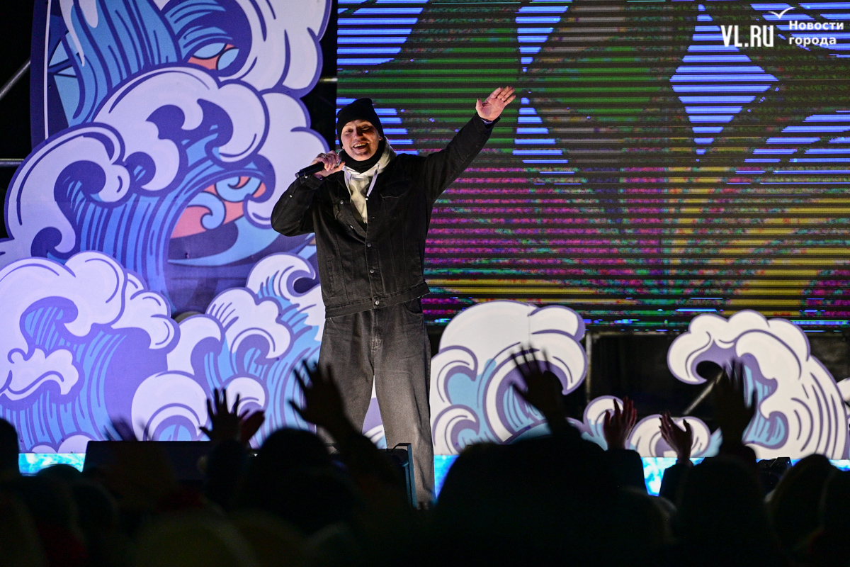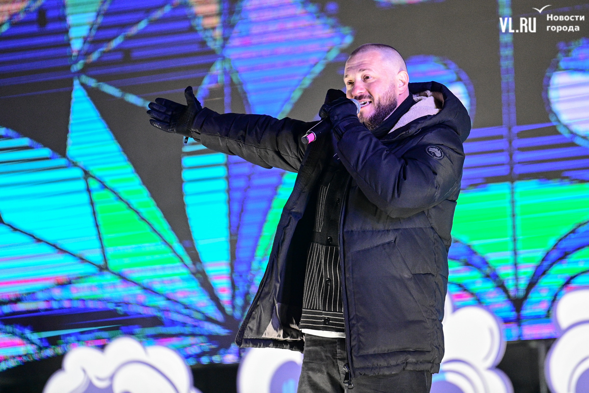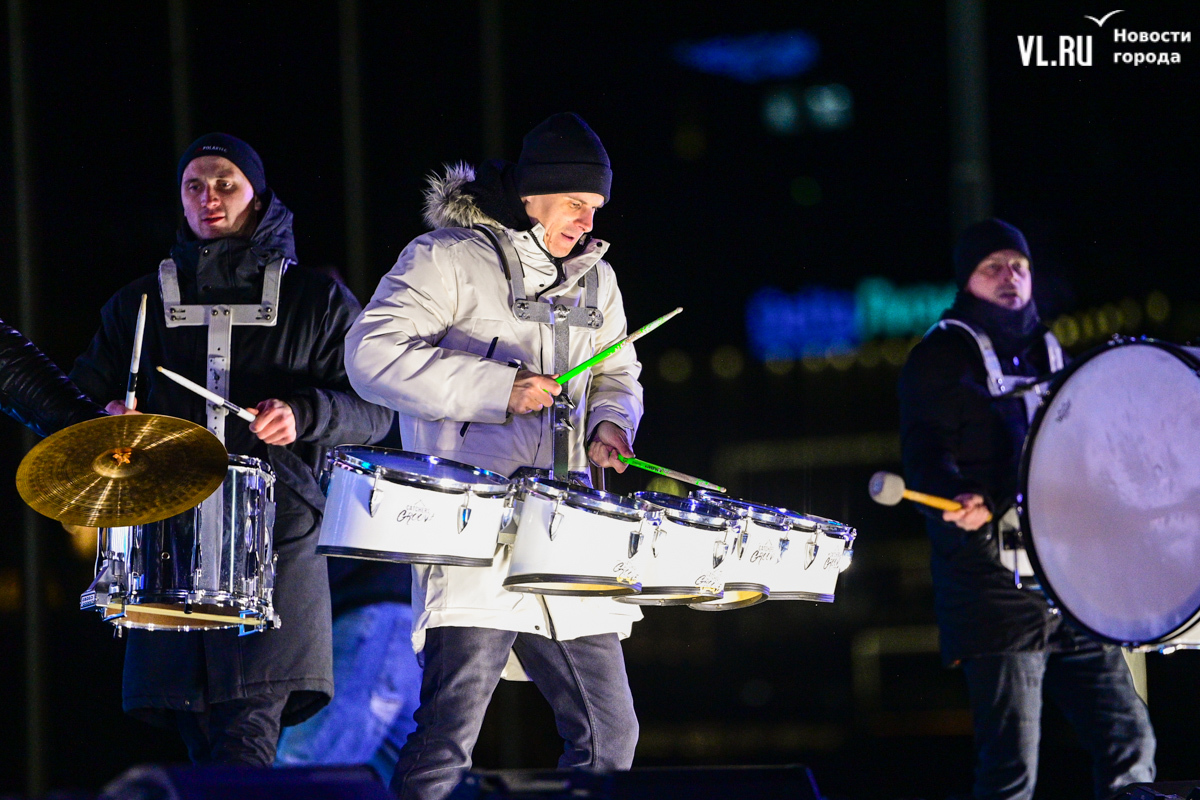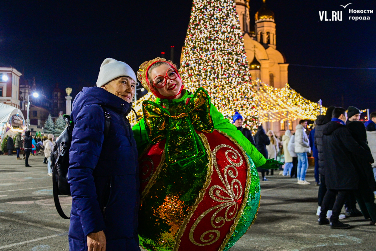 А на сцене с 18:00 ведущие изо всех сил поднимали настроение горожанам – спрашивали их о самых ярких событиях года, предлагали угадать песню и рассказать рецепт оливье. И ещё хвалили молодёжь и восторгались ею, что в Молодёжной столице за 2024-й стало уже нормой. Коллективы Владивостока помогали людям не замёрзнуть и вызывали вьюгу новогодними песнями про ледяной потолок и кружащийся снег. Радости зрителям добавляли аниматоры в блестящих костюмах ёлочных шаров, оленей, лошадей и пиратов.