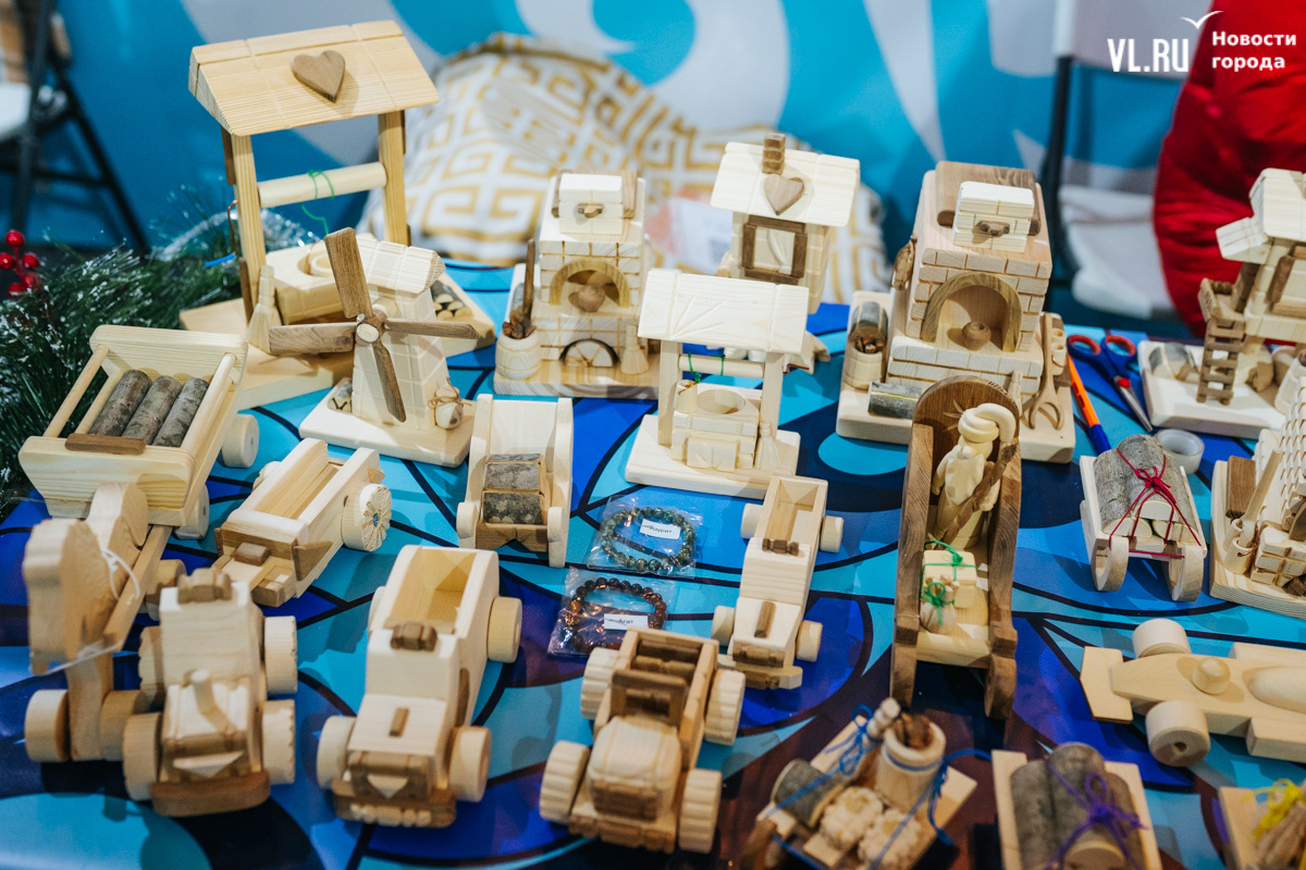 Зато в шатре мастеров было больше посетителей, может быть, потому что было там теплее. По периметру шатра расставили столы, а на них – вязаные, шитые, валяные игрушки, деревянные поделки, украшения, мыло и свечки, открытки владивостокских художников, пряники, вязаные шапки и варежки.