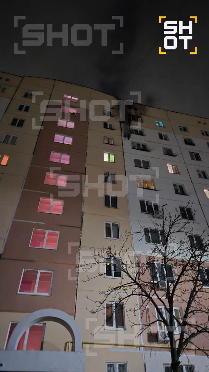 Украинский дрон врезался в жилой дом на улице Бородинской в Смоленске. Начался сильный пожар. На фасаде видна копоть — полыхал бензин после столкновения.