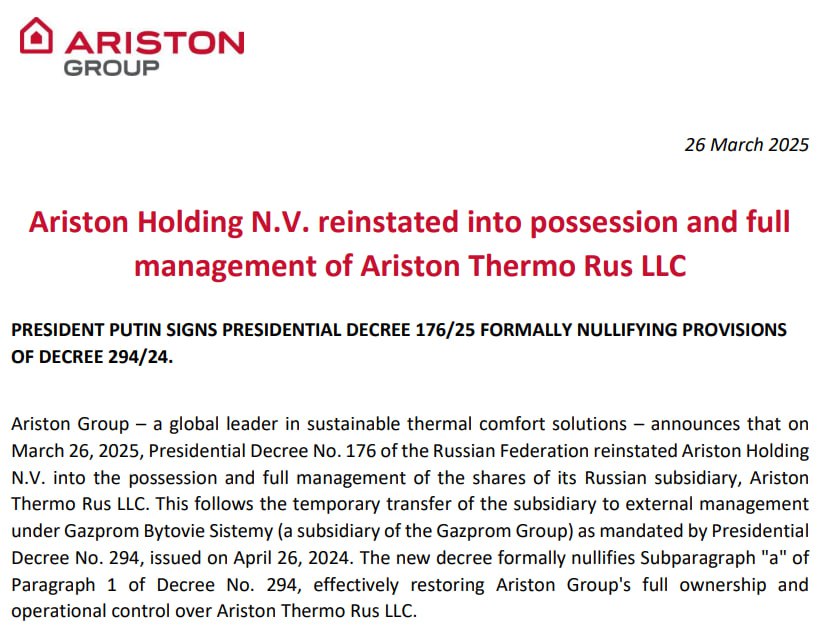 До этого собственность Ariston перешла "Газпром Бытовые Системы", но этот указ отменил вчера вечером Владимир Путин. 100% долей российской структуры Ariston были переданы в управление "Газпром бытовые системы" в апреле 2024 года.