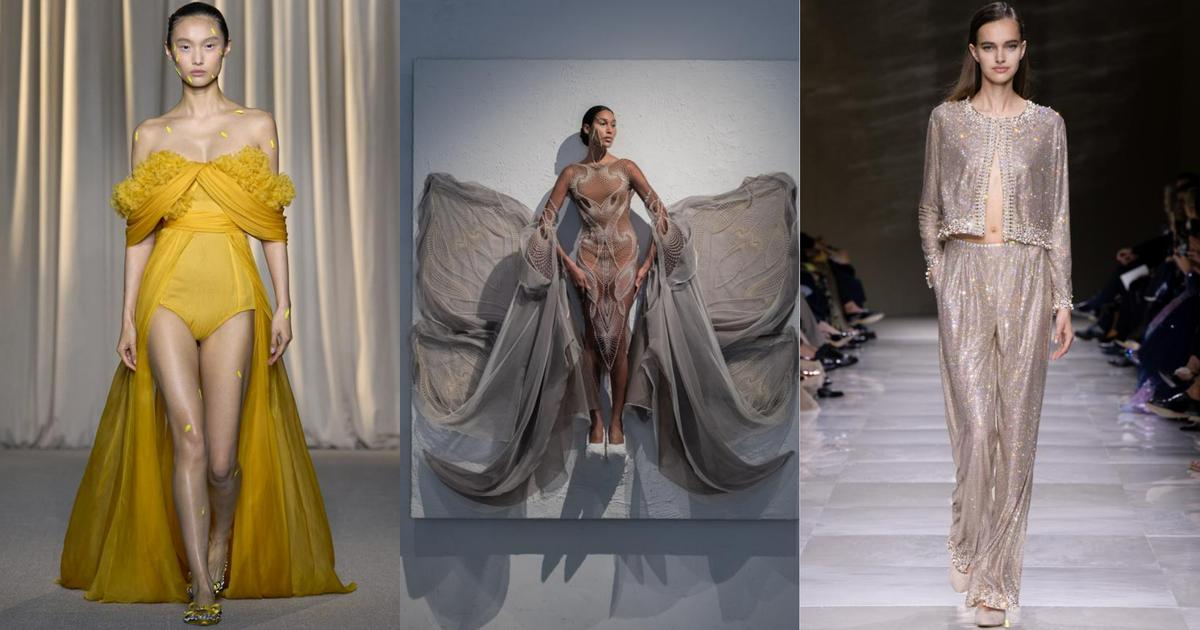 Le 30 juillet 2022, coup de théâtre !, le cabaret du Lido est contraint de ranger ses plumes, après soixante-seize ans de shows. Mais il n'aura pas fallu longtemps pour que le phénix renaisse de ses strass. Après moult protestations et une campagne de travaux pharaoniques, le Lido 2 Paris a rouvert ses portes fin 2023, à la manière d'un Broadway parisien dont le décor néo-Art déco est signé par le designer de mode Alexis Mabille. C'est donc ici, avenue des Champs-Élysées, ce 25 juin, que le Français convie ses clients extravagants, influenceurs et journalistes. Il est 13 h 30. Sur scène, une cascade coule à flots, et les ouvreurs servent du champagne, le pétillant donne d'ailleurs son nom à cette collection couture. Ses bulles se traduisent dans les rangées de perles tombant dans le creux du dos, sa robe dorée inspire la brillance du lamé et des paillettes, ses coupes (dont la première aurait été moulée sur le sein de Marie-Antoinette) deviennent le corset d'un fourreau. Clou du spectacle, la star du burlesque Dita Von Teese livre sa mythique performance du Glass Show, un effeuillage des plus glamours et arrosés dans une coupe géante. Une pluie de mousse se déclenche dans la salle, le public est ivre de bonheur.