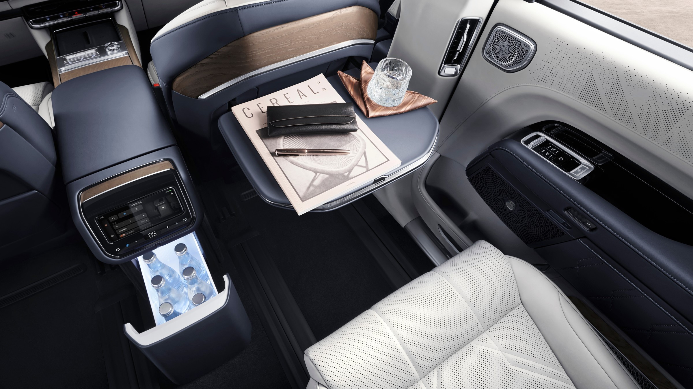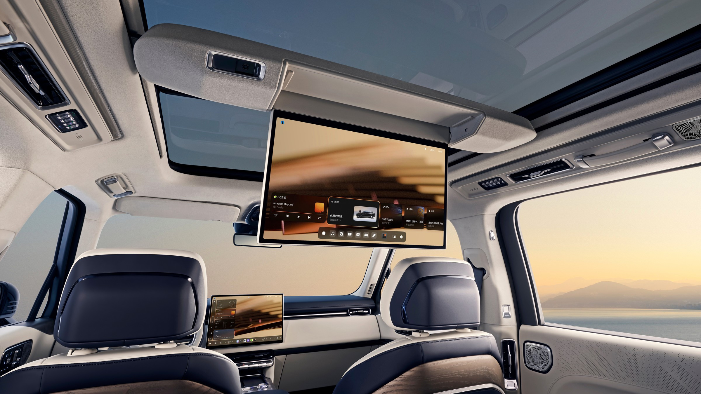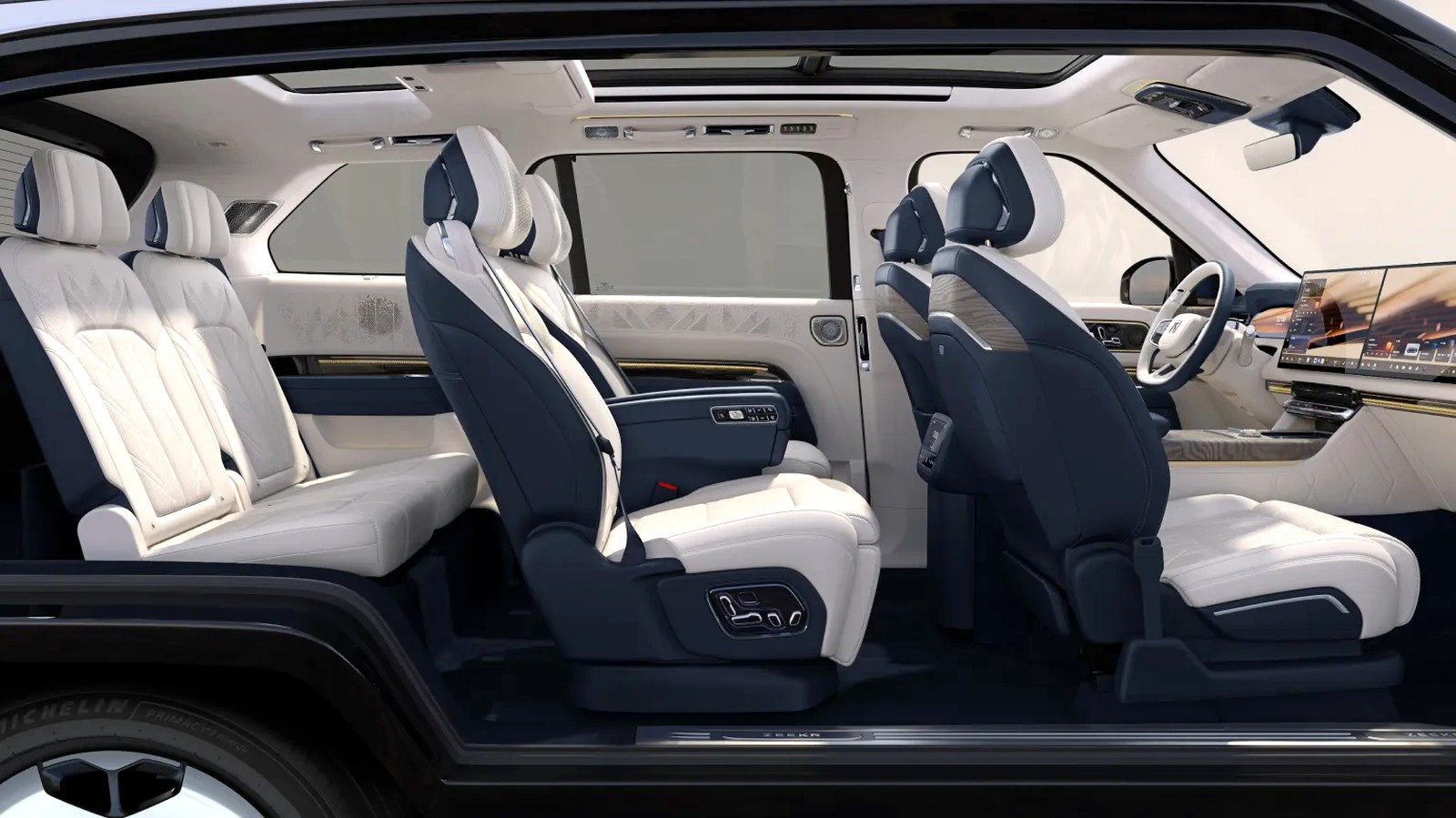 На передней панели салона установлены овальный 13-дюймовый приборный экран и большое табло, состоящее из двух 16-дюймовых экранов. В распоряжении водителя есть ещё 47-дюймовый проекционный экран дополненной реальности на лобовом стекле. Подсказки вдобавок могут проецировать прямо на дорогу фары автомобиля. Встроенные в кузов многочисленные органы искусственного зрения обеспечивают работу различных электронных ассистентов водителя, заявлен даже автопилот третьего уровня, но автопилоты такого уровня в Китае пока не легализованы — разрешён максимум второй. Объём багажника со всеми задействованными местами составляет 470 л, со сложенными креслами первого и второго рядов — 2148 л.