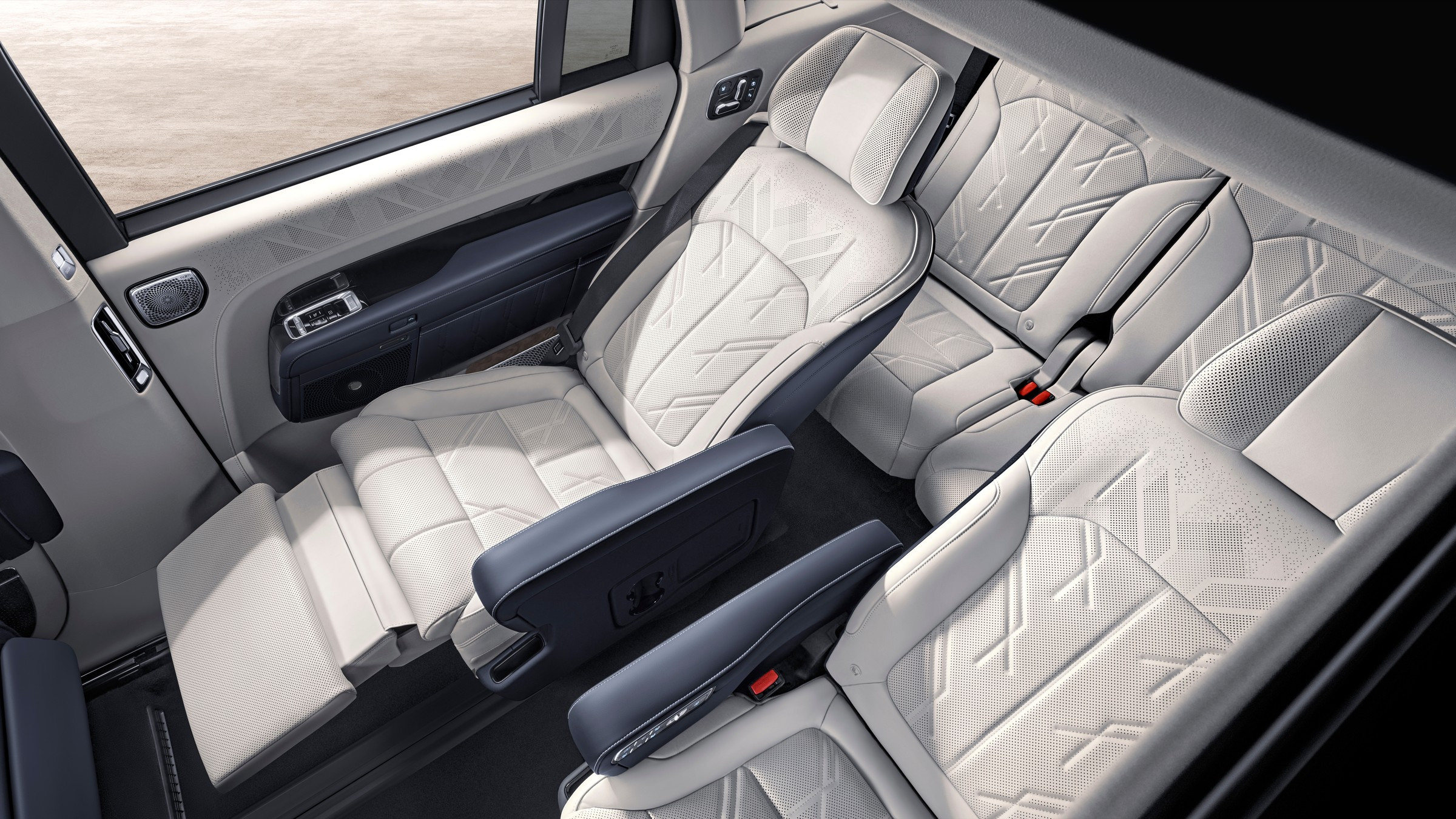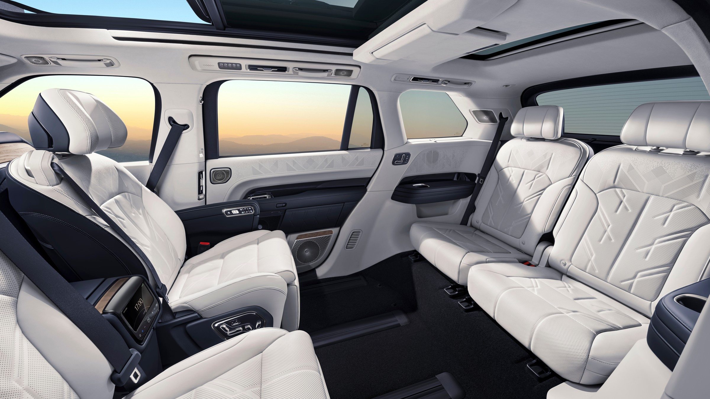 Салон Zeekr 9X имеет посадочную формулу 2+2+2, даже галёрка здесь состоит из двух раздельных «взрослых» кресел, хотя и не таких комфортных как в первом и втором рядах, где есть массаж и прочие удобства. Кресла второго ряда можно разворачивать на 180 градусов, что организовать мобильную переговорную. Бумажки, еду и напитки можно раскладывать на быстро монтируемом столике. Шампанское и минералку можно остудить в бортовом 9-литровом холодильнике. Для пассажиров второго ряда предусмотрены персональные столики в спинках передних кресел и 6,3-дюймовый настроечный планшет. В потолок вмонтирована передвижная консоль с 17-дюймовым телевизором для пассажиров. Штатная аудиосистема мощностью 3868 Вт насчитывает 32 динамика, караоке работает без микрофона.