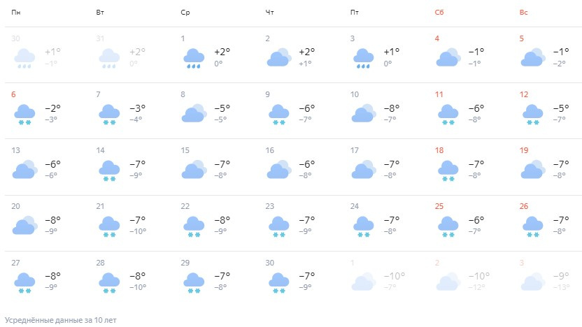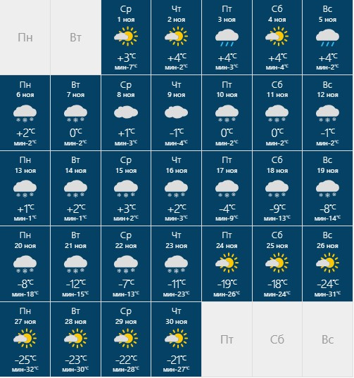 Сервис RusMeteo предупреждает о том, что в городе возможен затяжной снегопад, который продлится две недели, с 10 по 23 ноября. Ожидается, что после 11 ноября дневные температуры опустятся ниже 0 градусов. После этого будет постепенно холодать. В конце месяца, 25 ноября, температура днем может опуститься до -25 градусов, а ночью до -32 градусов.
