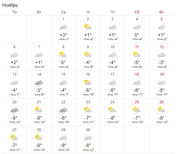 По информации сайта «Яндекс.Погода», в ноябре в Новосибирске температура опустится максимум до -8 градусов днем и -9 градусов ночью. 21 ноября, по прогнозу сервиса, в городе начнется десятидневный снегопад.