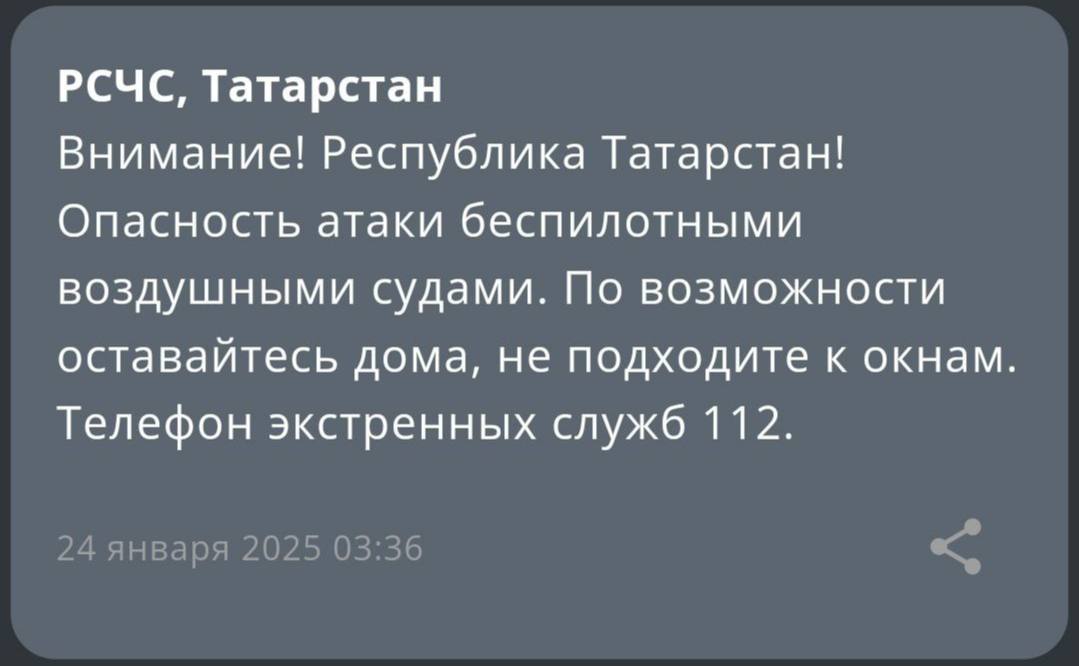 В Татарстане объявлена угроза атаки беспилотников. Жителям региона советуют оставаться дома и не подходить к окнам. Аналогичные предупреждения получили и жители Самарской области.
