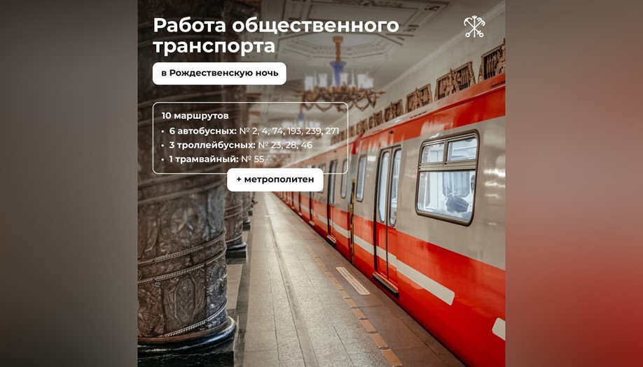 Во время празднования Рождества, ночью 7 января, в Петербурге запустят шесть автобусных (№2, 4, 74, 193, 239, 271), три троллейбусных (№23, 28, 46) и один трамвайный маршрут (№55).