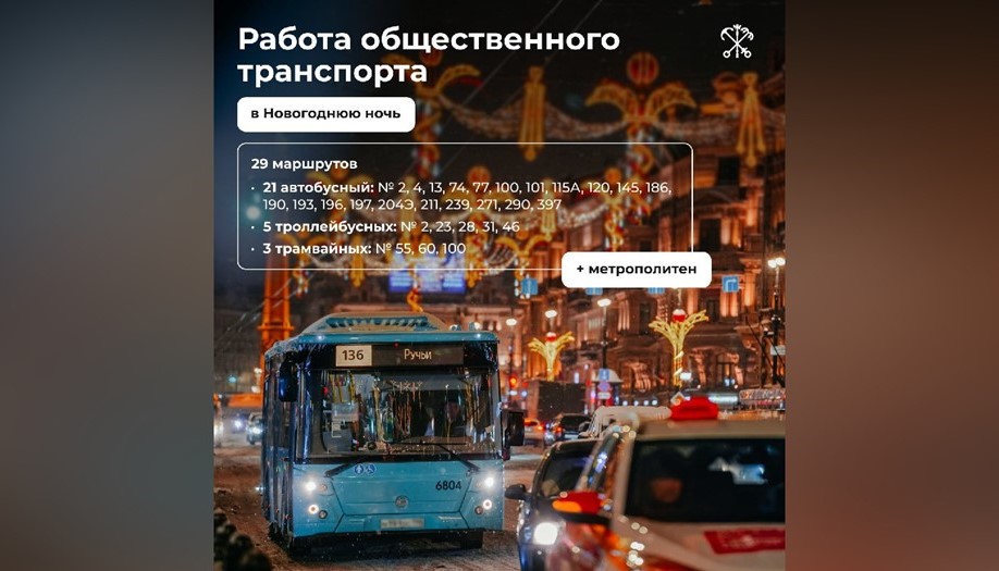 Как рассказали в пресс-службе городского правительства, речь идёт об 21 автобусе, пяти троллейбусах и трёх трамваях. Так, в новогоднюю ночь жители и гости Северной столицы смогут воспользоваться: