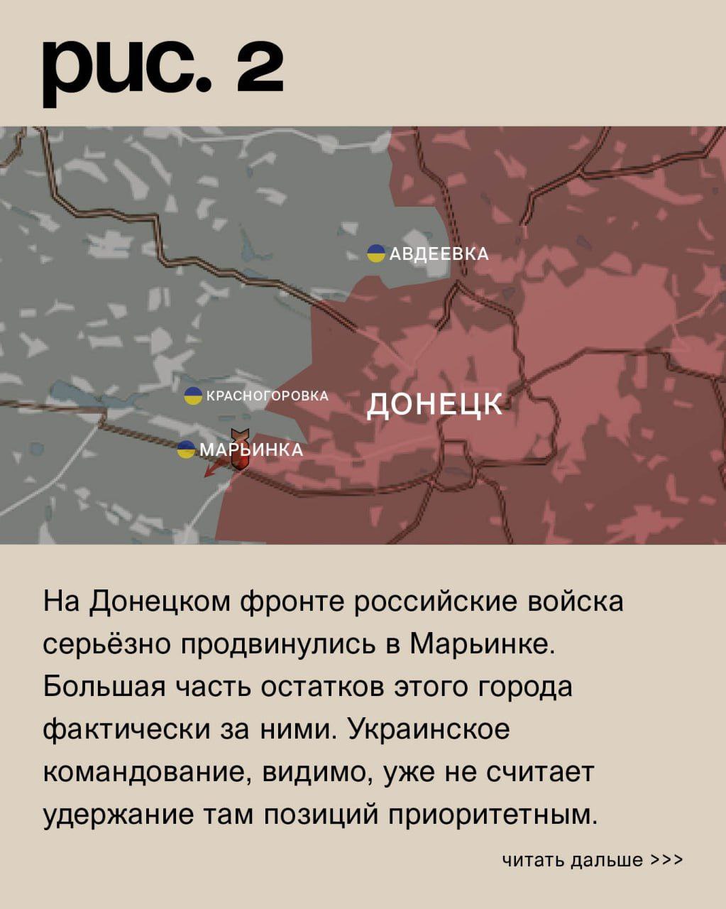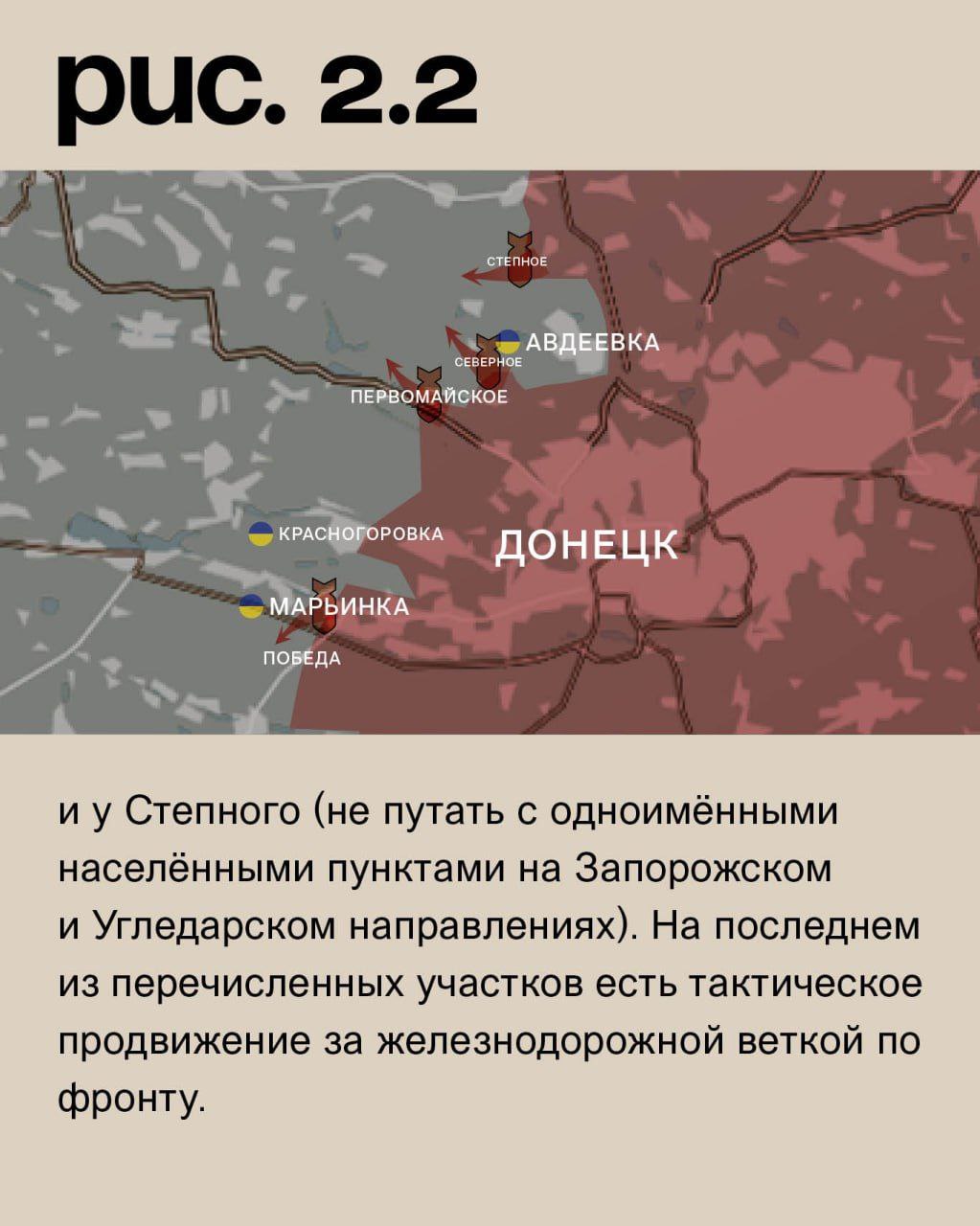 На Донецком фронте российские войска серьёзно продвинулись в Марьинке. Большая часть остатков этого города фактически за ними. Украинское командование, видимо, уже не считает удержание там позиций приоритетным. С оперативной точки зрения это для ВСУ проблема. На этом она не закончилась. Укрепрайон в Победе уже будет сложно держать. ВС РФ при поддержке средств дальнего поражения атаковали у Первомайского, Северного (населённый пункт к западу от Авдеевки) и у Степного (не путать с одноимёнными населёнными пунктами на Запорожском и Угледарском направлениях). На последнем из перечисленных участков есть тактическое продвижение за железнодорожной веткой по фронту. (Рис. 2)