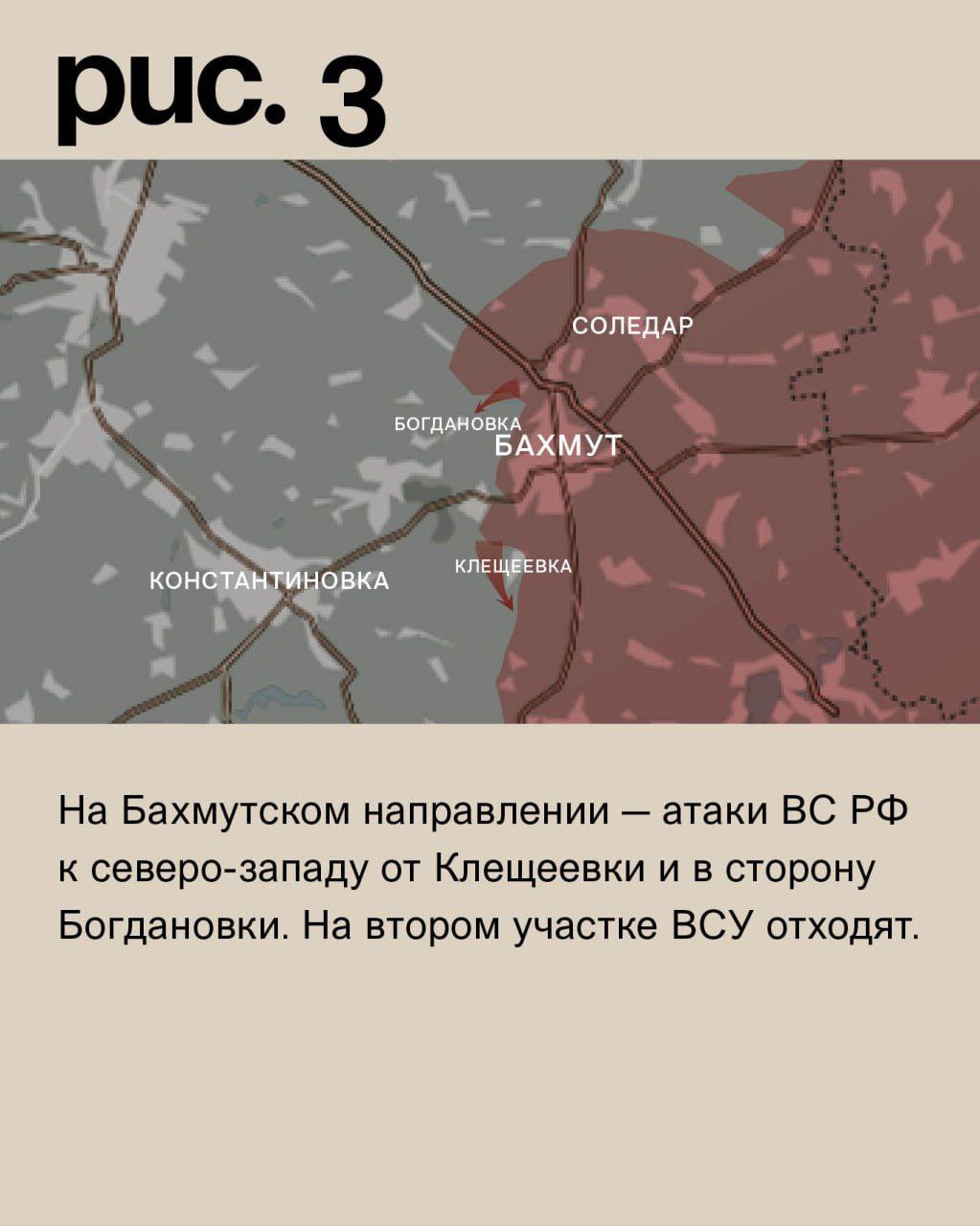 На Бахмутском направлении – атаки ВС РФ к северо-западу от Клещеевки и в сторону Богдановки. На втором участке ВСУ отходят. (Рис. 3)