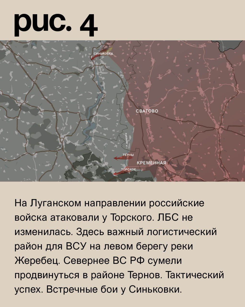 На Луганском направлении российские войска атаковали у Торского. ЛБС не изменилась. Здесь важный логистический район для ВСУ на левом берегу реки Жеребец. Севернее ВС РФ сумели продвинуться в районе Тернов. Тактический успех. Встречные бои у Синьковки. (Рис. 4)