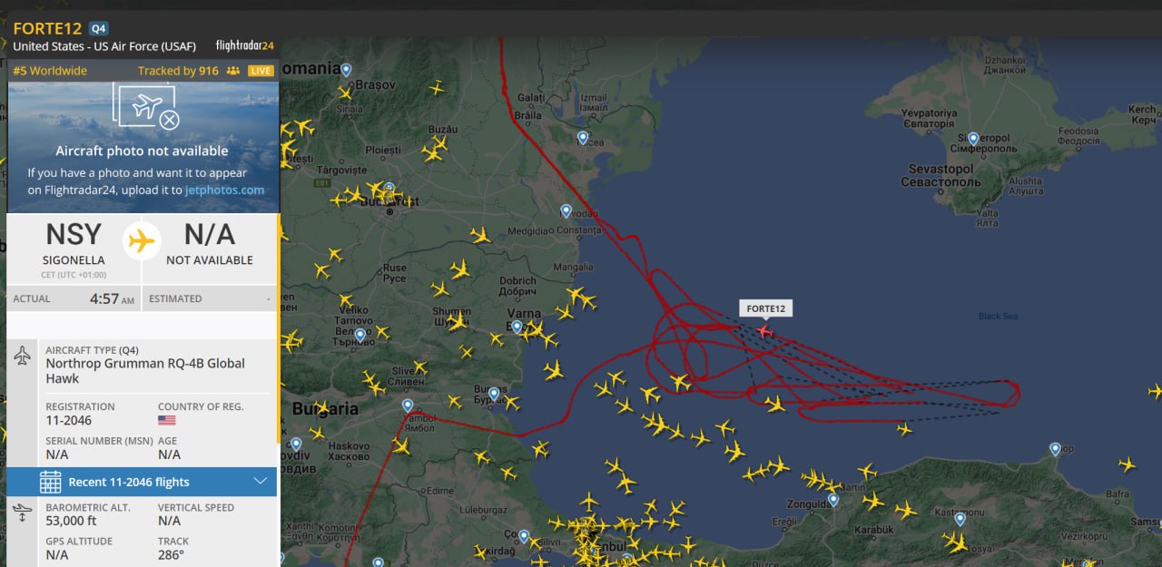 Американский разведывательный БПЛА RQ-4B Global Hawk в течение всего дня работает над юго-западной частью акватории Черного моря.