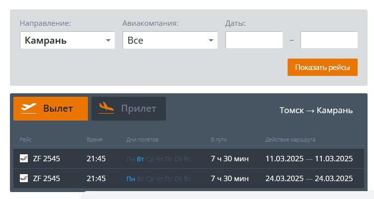 ➖ Томск — Нячанг: с 11 марта примерно раз в 8 дней
