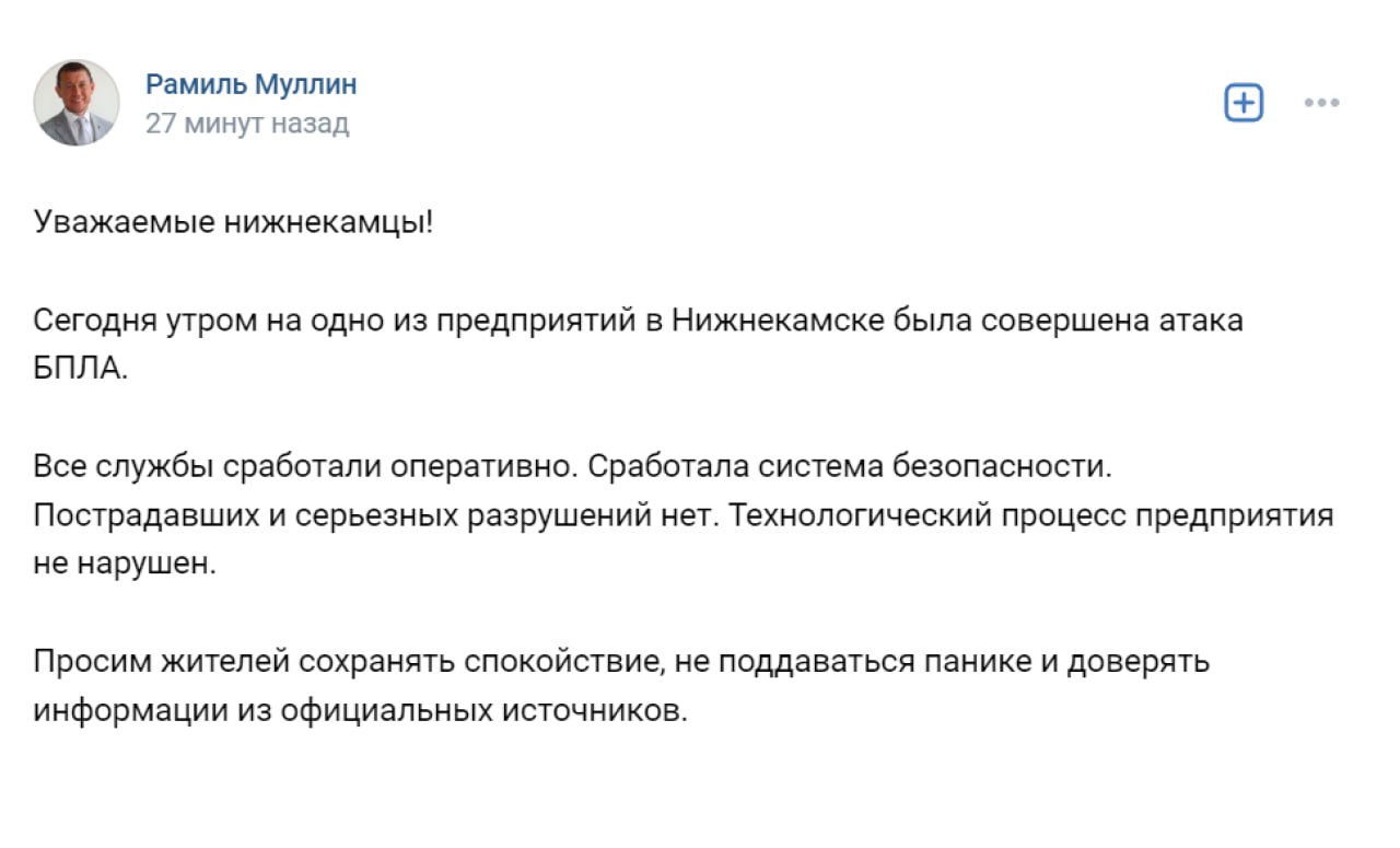«Сегодня утром на одно из предприятий в Нижнекамске была совершена атака БПЛА. Все службы сработали оперативно. Сработала система безопасности. Пострадавших и серьёзных разрушений нет. Технологический процесс предприятия не нарушен».