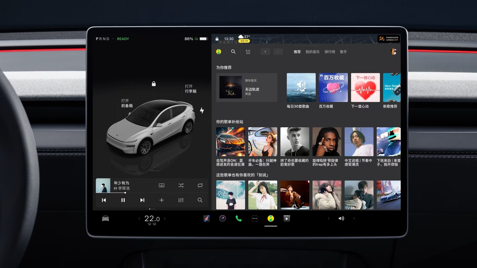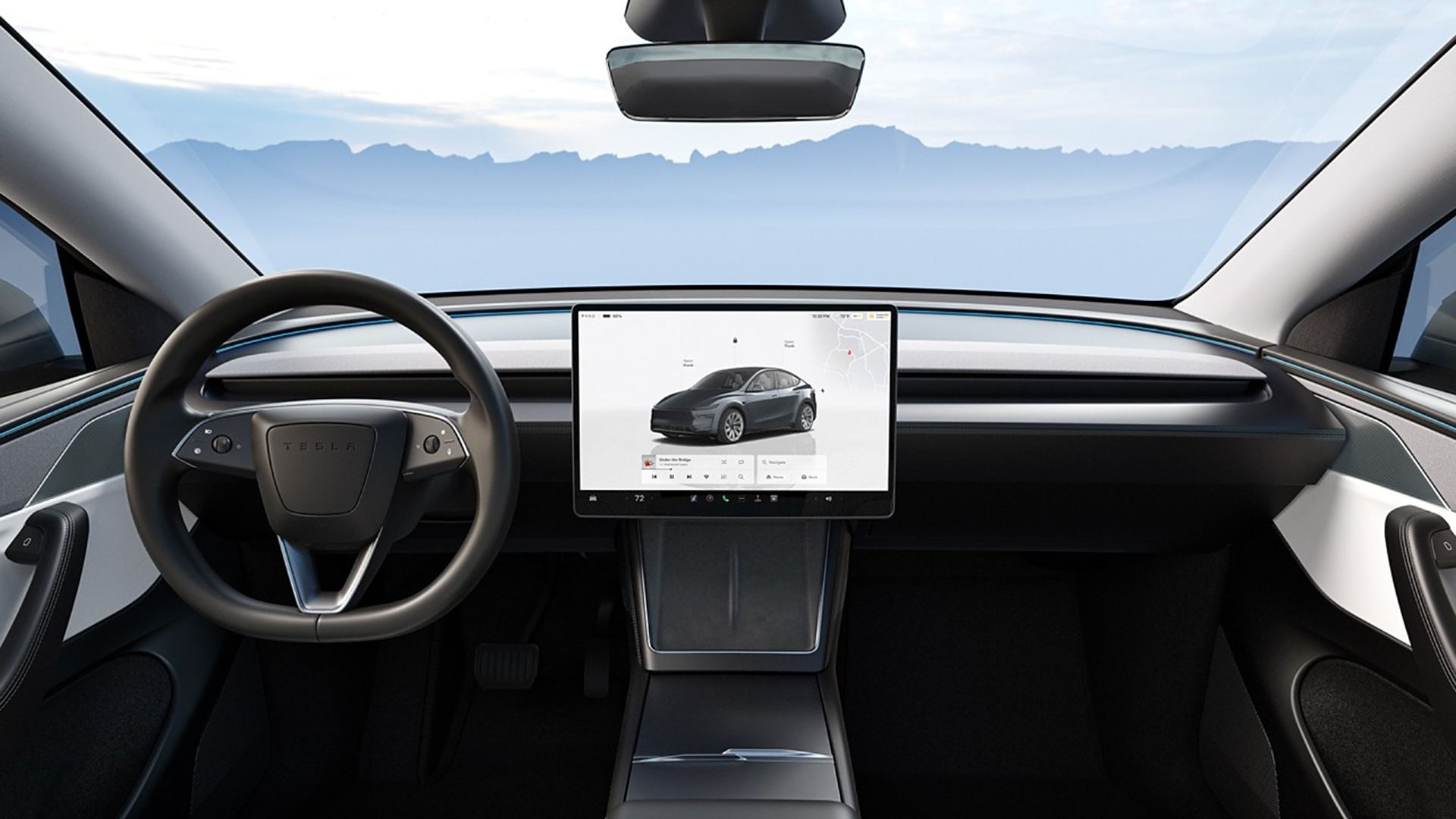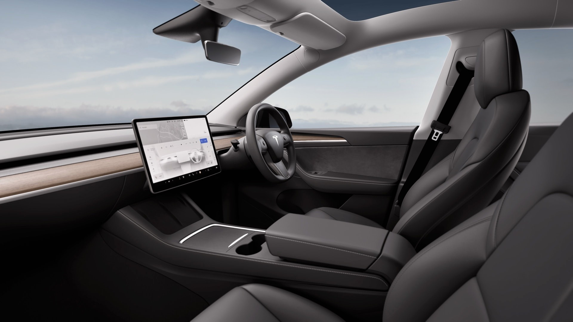Салон Tesla Model Y обновлён в том же ключе, что у родственного седана Tesla Model 3, пережившего рестайлинг ещё в 2023 году: появился новый руль и развлекательный монитор для пассажиров второго ряда (на нём можно запускать видеоигры), улучшены отделочные материалы и салонное освещение, ради более удобной посадки изменена форма сидений второго ряда (удлинены подушки, расширены подголовники), установлена новая аудиосистема с 16 громкоговорителями. Физические кнопки и регуляторы есть, по сути, только на руле, однако на праворульной версии замечен левый подрулевой рычажок. В любом случае, подавляющее большинство функций и настроек зашиты в 15,4-дюймовый сенсорный экран, прикрученный к центру передней панели.