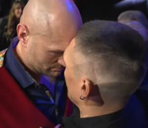 На прошедшем мероприятии не обошлось без традиционной «битвы взглядов» — уже не первой для Усика и Фьюри в общем, но первой с того момента, как из бой наконец-то объявили официально.