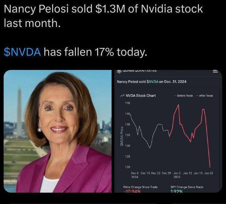 Лучший трейдер-конгрессмен Нэнси Пелоси 31 декабря продала акции Nvidia. Вчера они упали на 17%.