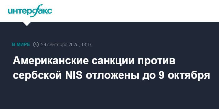 Москва. 29 сентября. INTERFAX.RU - США перенесли начало применения санкций против сербской энергокомпании NIS ещё на восемь дней, сообщают СМИ Сербии со ссылкой на президента страны Александра Вучича.