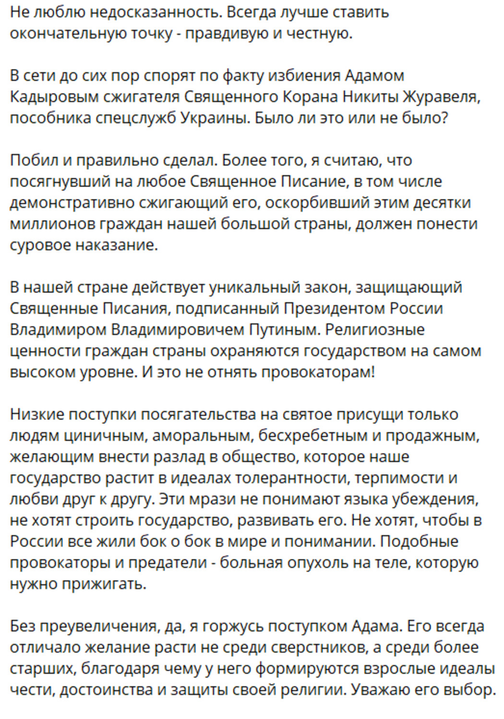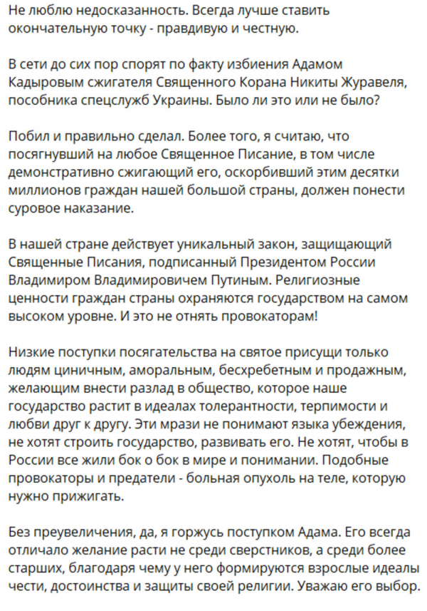 Видео мне пересказали. Первое - я думаю, что сжигание Корана это, безусловно, серьёзное преступление. Это серьезная провокация, в нашей многоконфессиональной стране это недопустимо. Это преступление должно караться законом. Второе - есть правила содержания под стражей обвиняемых и подозреваемых. Эти правила должны соблюдаться. И третье, что я думаю - суд вынесет справедливое решение в отношении обвиняемого в сжигании Корана.Насколько известно, Никита Журавель всё ещё находится в грозненском СИЗО.