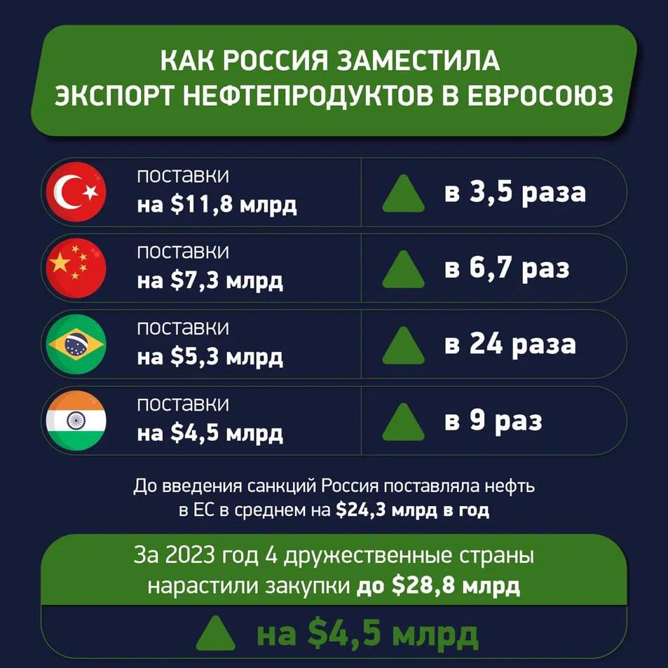 Турция, Китай, Индия и Бразилия купили в 2023 году российскую нефть на $28,8 млрд. Объём поставок основному покупателю – Турции вырос в 3,5 раза, а Бразилии – в 24 раза! (см. инфографику).