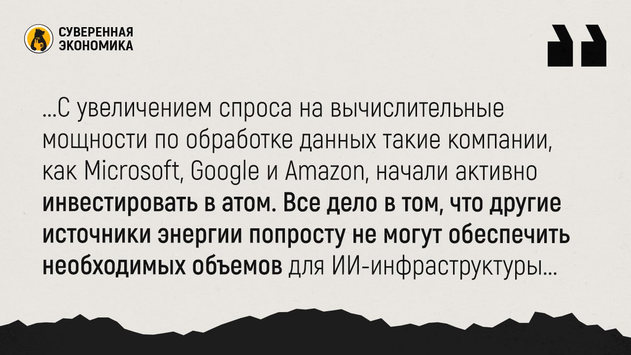 Атомная энергетика становится важнейшим элементом для поддержки и развития инфраструктуры ИИ. С увеличением спроса на вычислительные мощности по обработке данных такие компании, как Microsoft, Google и Amazon, начали активно инвестировать в атом. Все дело в том, что другие источники энергии попросту не могут обеспечить необходимых объемов для ИИ-инфраструктуры.