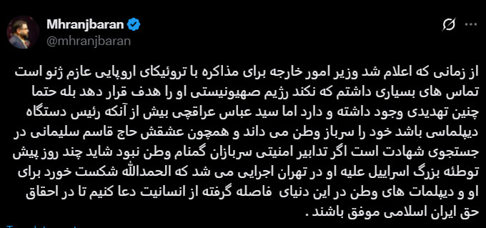 «С тех пор, как было объявлено, что министр иностранных дел уезжает в Женеву для переговоров с европейской «тройкой», я много раз звонил, чтобы убедиться, что сионистский режим не преследует его. Да, такая угроза безусловно была и есть. Тем не менее, Сейед Аббас Аракчи считает себя солдатом родины больше, чем главой дипломатической службы <...>. Если бы не меры безопасности <...> возможно, несколько дней назад в Тегеране был бы осуществлен крупный израильский заговор против него, который, слава Богу, провалился <...>.