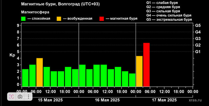 В ночь на 17 мая астрофизиками зафиксирована мощная магнитная буря, чей Kp-индекс равен 6,33 баллам и соответствует уровню магнитной буре класса G2.3.