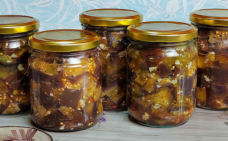 Ингредиенты: Баклажаны – 2 кг Чеснок – 3 головки (80–100 г) Укроп – 50 г Соль – 3 ч. л. (30–35 г) Масло подсолнечное – 180 мл Уксус 9% – 60 мл Лавровый лист – 2 шт. Перец черный горошком – 5–6 шт. Перец душистый – 2 шт. Вода – для варки и стерилизации