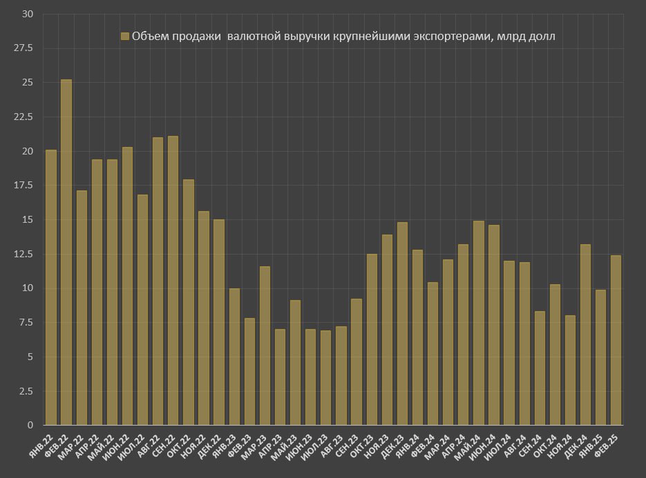 Объем чистых продаж валюты со стороны экспортеров увеличился до $12.4 млрд в феврале vs $9.9 млрд в январе, достигнув максимума с дек.24 ($13.2 млрд), за последние три месяца – $11.8 млрд в среднем за месяц, за полгода – $10.4 млрд.