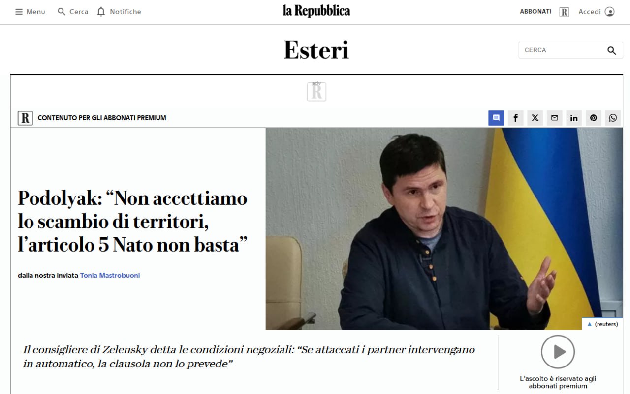 Об этом заявил советник главы офиса Зеленского Подоляк в интервью газете La Repubblica.