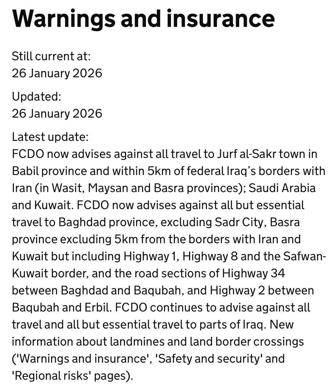 Власти Великобритании призвали своих граждан не посещать районы в радиусе около 5 км от границы с Ираном, Кувейтом и Саудовской Аравией, а также не приезжать в Багдад