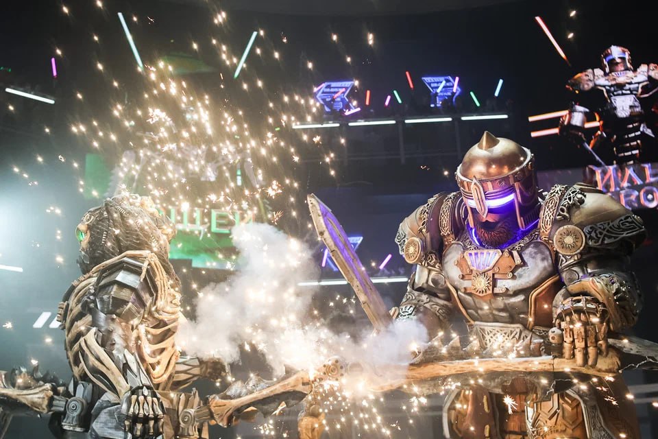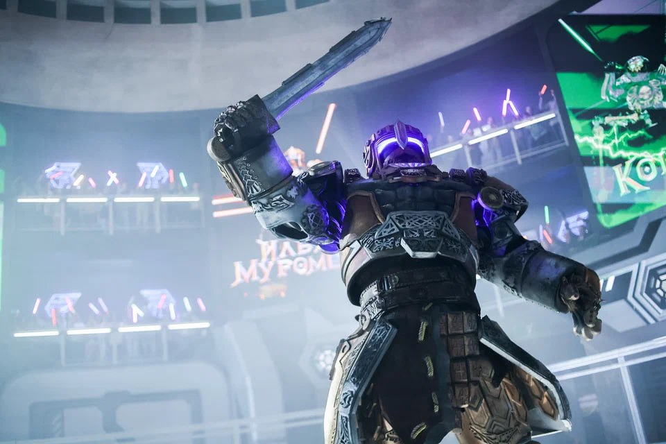 Фотографиями со съёмочной площадки поделился «Кинопоиск». Картина расскажет о противостоянии Ильи Муромца (Владимир Любимцев) и Соловья-разбойника (Никита Ефремов) в альтернативном будущем. Выяснять отношения главные герои будут на «Робоарене».