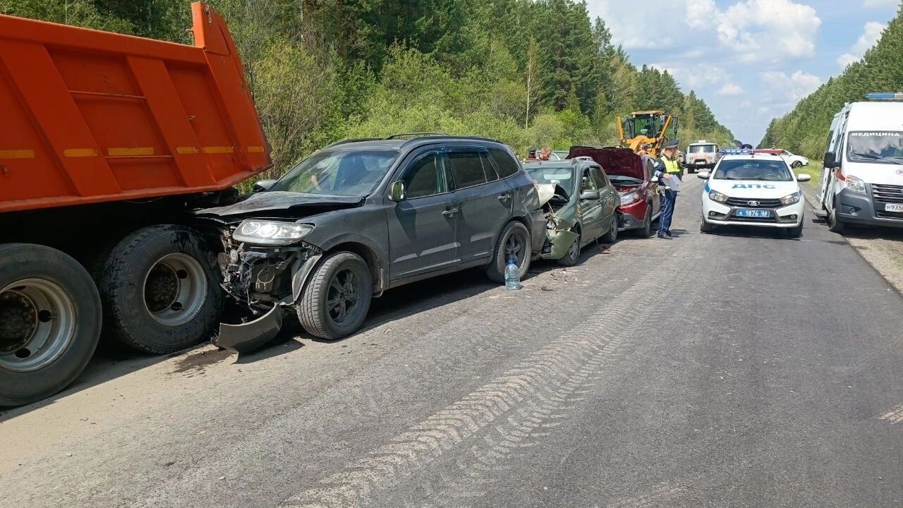 26 июня в полдень на трассе Талица-Бутка произошло ДТП. КамАЗ очищал трассу от грязи и пыли, что ухудшило условия видимости для автомобилистов. Итак, Hyundai столкнулся с грузовиком, а за ним в него врезался легковой автомобиль Lada, а затем и Chevrolet. Пострадал только водитель автомобиля Lada.