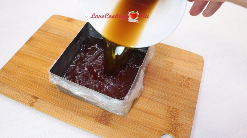Заливаем в форму и убираем на ночь в холодильник. Дно формы я затянула пищевой плёнкой.