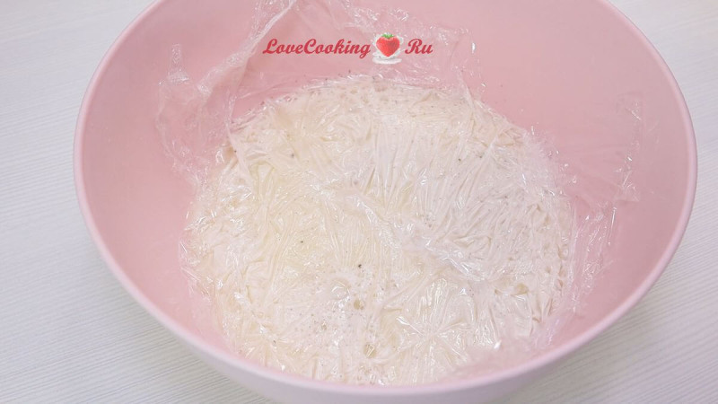 Накрываем пищевой плёнкой в контакт и убираем на ночь в холодильник.