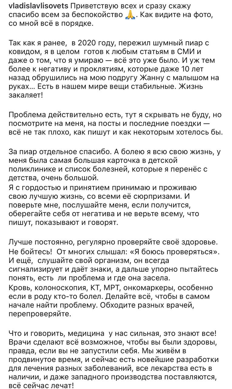 «Как видите на фото, со мной все в порядке. Проблема действительно есть, тут я скрывать не буду, но посмотрите на меня, на посты и последние поездки — все не так плохо, как пишут и как некоторым хотелось бы. Помните, что каждое хорошее слово и признание в любви прибавляют секунды, часы, годы жизни вам и вашим близким. Есть такое понятие — лечение, словом. Я продолжаю».