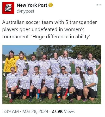 В Австралии футбольная команда с 5 трансгендерами в составе выиграла молодежный женский турнир в одну калитку, победив во всех матчах. В том числе в одном со счетом 10:0, где один из трансов забил 6 голов. Некоторые родители не разрешали своим дочерям выходить на поле против гей-клуба, опасаясь травм. И были абсолютно правы.