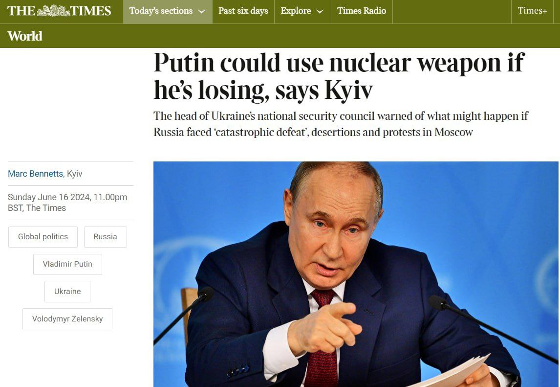 Путин может приказать применить тактическое ядерное оружие, если российская армия терпит поражение в Украине, - заявил секретарь СНБО Александр Литвиненко в интервью The Times