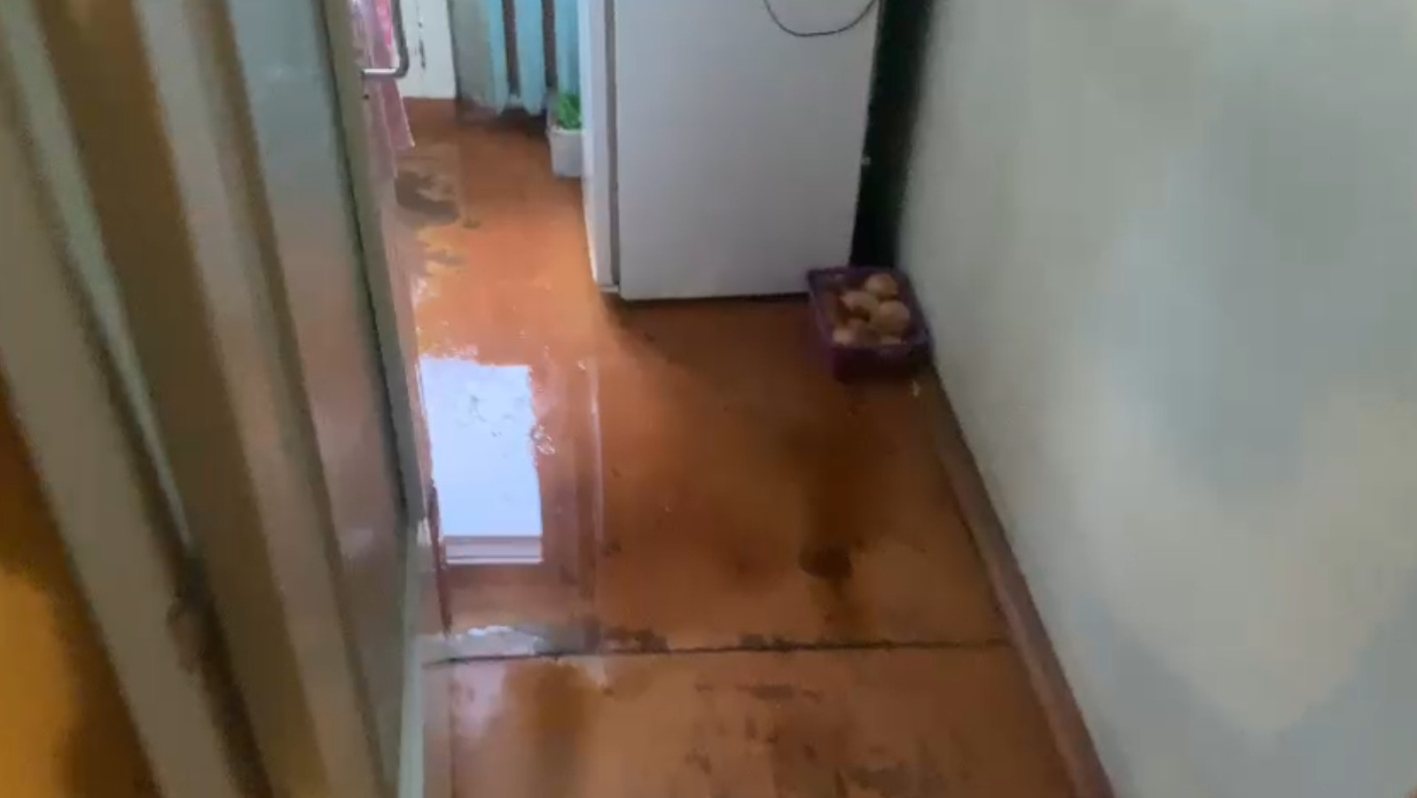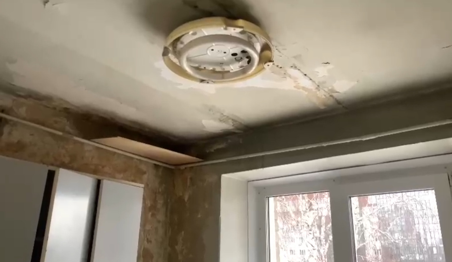 На видеозаписи видно, как пенсионерка поставила на пол ведро, повсюду капает вода. Повсюду на полу видны лужи. Потолок в квартире испещрен следами от прошлых подтоплений. По информации Карины, последнее было в декабре.