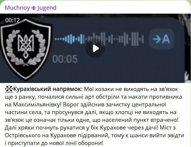 «Мои казаки не выходят на связь с утра, начались сильные арт обстрелы и накаты противника на Максимильяновку! Враг осуществил зачистку центральной части села и продвинулся дальше, если ребята не выходят на связь это означает только одно, что населенный пункт потерян», – пишет он.