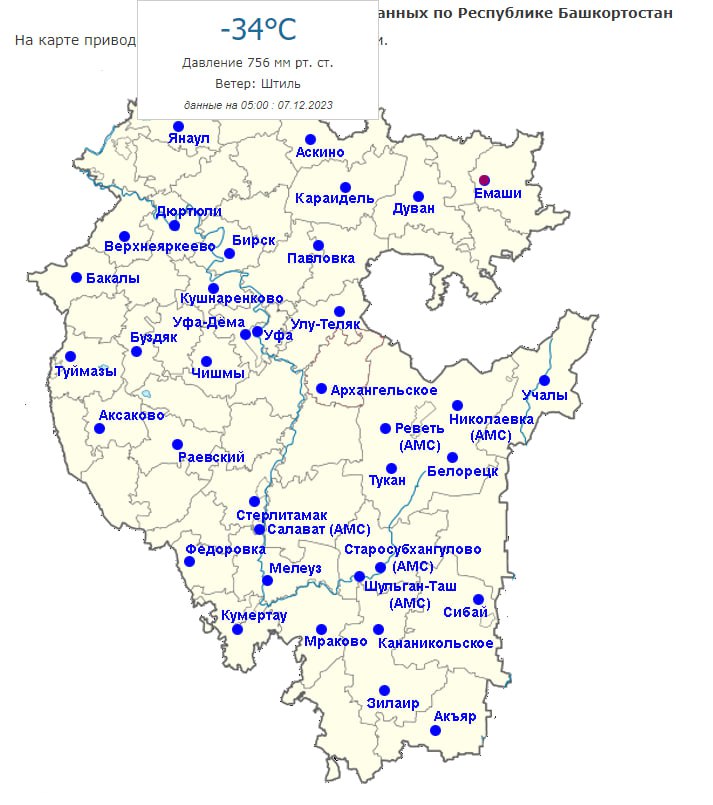 Согласно интерактивной карте метеоданных по Башкирии, на 5:00 7 декабря в Уфе температура воздуха опустилась до -20°, Стерлитамаке — до -14°, Янауле – до -32°, Туймазах — до -14°, Учалах — до -29°, Акъяре — до -15°, Белокатайском районе – до -34°.