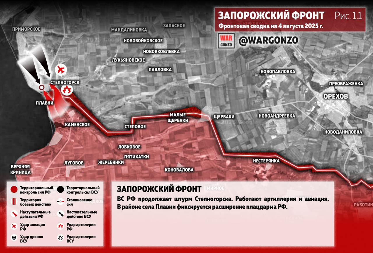 Запорожский фронт. ВС РФ продолжает штурм Степногорска. Работают артиллерия и авиация. В районе села Плавни фиксируется расширение плацдарма РФ. Идут бои у Орехова. (Рис. 1)