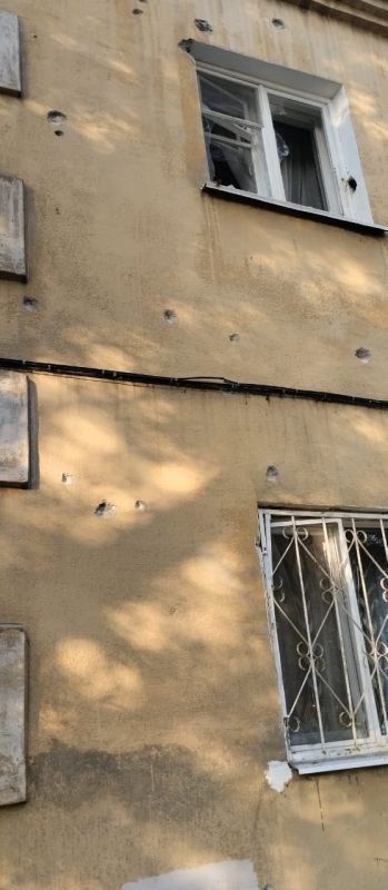На снимках видно повреждённый фасад одного из домов. На лицевой стороне остались дыры после падения обломков. Специалисты начали обход повреждённых квартир.