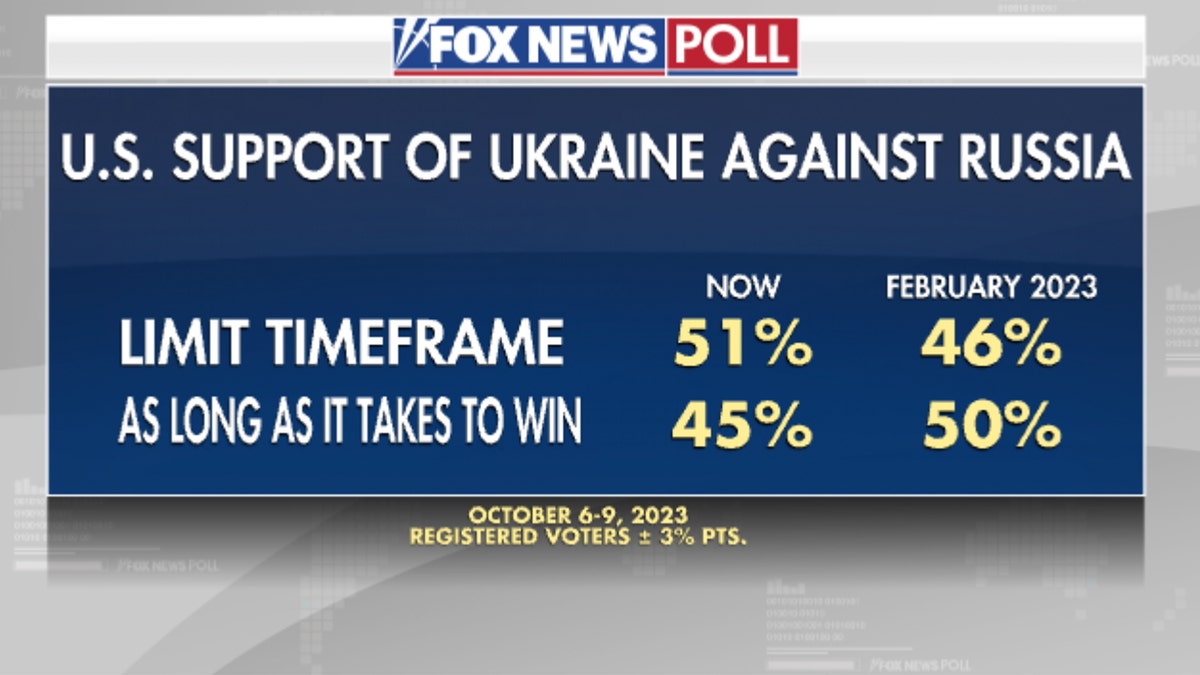 A new Fox News survey finds voters are now more likely to feel U.S. support of Ukraine should have a limited timeframe as opposed to waiting as long as it takes for them to win.